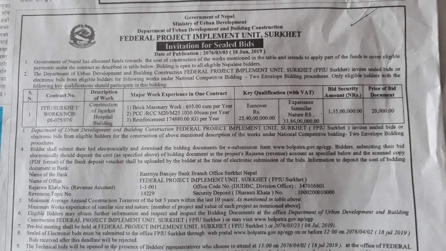 जाजरकोट ः जाजरकोटमा जिल्ला अस्पतालको भवन र आवश्यक पुर्वाधार वन्ने भएको छ । शहरी विकास मन्त्रालयको अन्र्तगतको संघिय आयोजना कार्यान्वयन ईकाई सुर्खेतले जिल्ला अस्पतालको भवनसहित अन्य पुर्वाधार निर्माणको लागी सोमबार बोलपत्र आह्वान गरेको छ । यो भवनको लागत करिव ३३ करोड रहेको छ ।