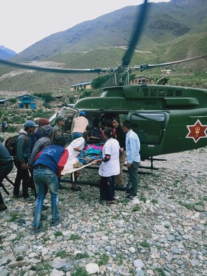 त्रिपूरासुन्दरी नगरपालिका– २ की २० वर्षीया अनिसा बुढाको स्वास्थ्य अवस्था जोखिममा रहेको जानकारी दिएपछि उहाँलाई उद्धार गरी हेलिकप्टर मार्फत सुर्खेत स्थित प्रदेश अस्पतालमा लगिएको डोल्पाका प्रमुख जिल्ला अधिकारी मुकेशकुमार केसरीले जानकारी दिनुभयो । दुई दिन देखि सुत्केरी हुँन नसक्दा समस्य भएको थियो उहाँका श्रीमान् गोपाल बुढाले जानकारी दिनुभयो ।