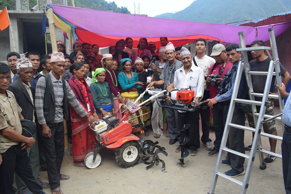कृषकलाई पावर ट्रेलर, खाल्डा खन्ने मेसिन, पावर स्प्रेयर, सिकेचर, फुट स्प्रेयर, भ¥याङ, आरी, कैंची, जुसर मेसिन, तौल मेसिन, स्पिङ्कलरलगायत कृषि औजार वितरण गरिएको हो । “हामीले वितरण गरेका उपकरण बिरुवा लगाउँदादेखि फल निकाल्दासम्म प्रयोगमा आउनेछन्”, रिजालले भन्नुभयो, “सुन्तलाको बगैंचा व्यवस्थापन, सिँचाइ, गोडमेल, खनजोत, खाल्डा खन्न, सुन्तला टिप्न र भण्डारण गर्न चाहिने सबै सामग्री किसानलाई उपलव्ध गराइएको हो ।” कस्टम हाइरिङ सेन्टर र पोस्ट हारभेस्ट सेन्टर कार्यक्रमको रकमबाट किसानलाई कृषि औजार वितरण गरिएको परियोजनाले जनाएको छ ।