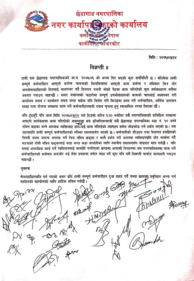 कार्यालयको काम गरिरहेका बेला मंगलबार आज दिउँसो साढे १ बजे छेडागाड नगरपालिका–१० का नबिन खड्काले सव ईञ्जिनियर भुपेन्द्र खत्रीमाथि हातपात गरेका हुन् ।