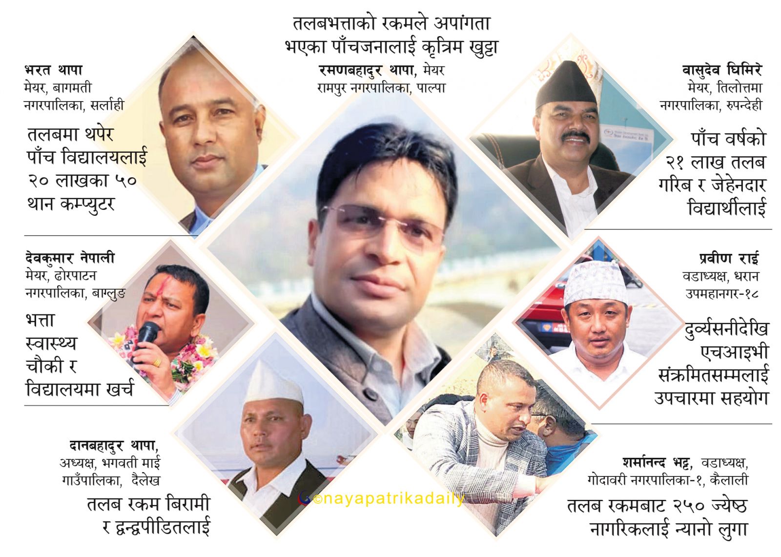 पाल्पारपाल्पाको रामपुर नगरपालिकाका मेयर रमणबहादुर थापाले आफ्नो खातामा अहिलेसम्म जम्मा भएको एक लाख ७५ हजार रुपैयाँ तलबले पाँचजना अपांगता भएकालाई खुट्टा हालिदिएका छन् । बैंकमा जम्मा भएको बाँकी तलबले एम्बुलेन्स किन्ने योजना रहेको थापाले बताए । उनले निजी खर्चले दुई विद्यार्थीको कलेज फी तिरिदिएका छन् । उनले कार्यालयको काममा समेत आफ्नै गाडी चढ्ने गरेका छन् । मेयर थापाले मासिक ३५ हजार तलब पाउँछन् ।