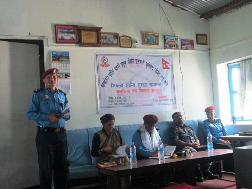 जिल्ला प्रहरी कार्यालय जुम्लाको आयोजनामा सम्पन्न भएको शान्ति सुरक्षा सम्बन्धी अन्र्तरक्रिया कार्यक्रममा उनीहरुले जनताको जीउ धनको सुरक्षा गर्नु प्रहरीको जिम्मेवारी भएकोमा जोड दिए। उद्योग बाणिज्य संघ जुम्लाका बरिष्ठ उपाध्यक्ष पुरीचन्द्र देवकोटाले यहाँ ठुलठुला उद्योग कलकारखाना नभएकोले शान्ति सुरक्षाको अवस्थामा खासै ख्याल नुपगेको बताए। सदरमुकामको बजार अन्धकारमय छ। ठुलठुला उद्योग पनि छैनन्।