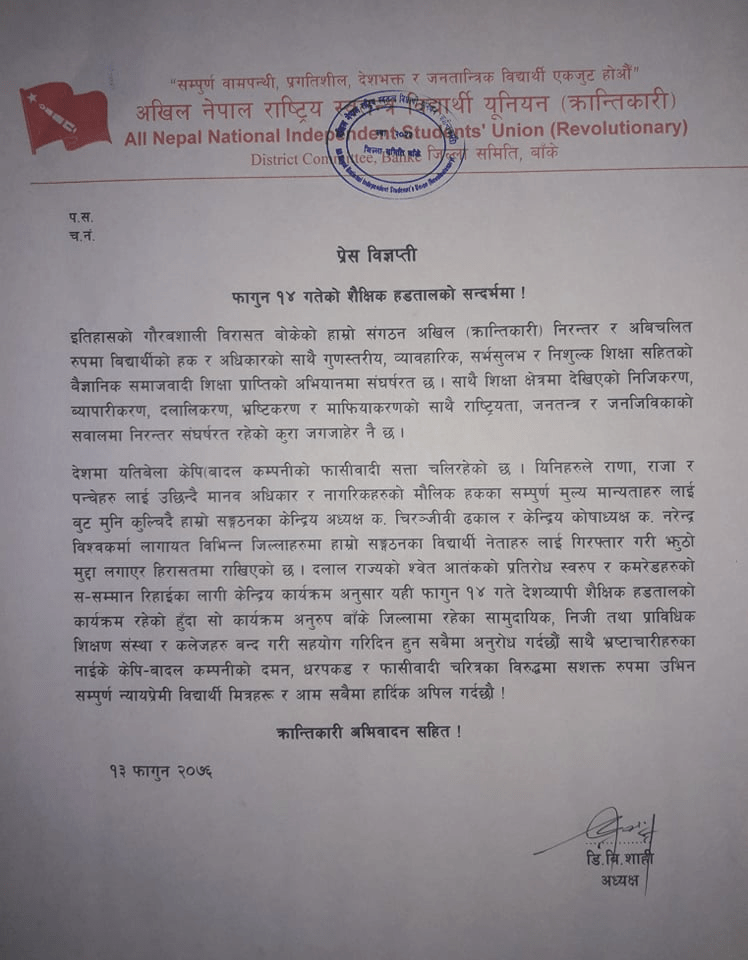 विप्लव समूहद्वारा शैक्षिक आम हडतालको घोषणा