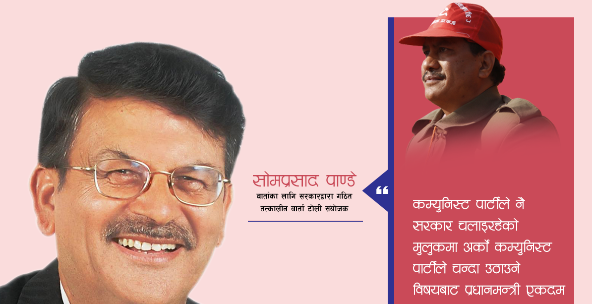 सत्तारूढ दल नेपाल कम्युनिस्ट पार्टी (नेकपा) सांसद तथा संविधानसँग असन्तुष्ट रहेका समूहहरूसँग वार्ता गर्ने भनिएको तत्कालीन राजनीतिक वार्ता समितिका संयोजक सोमप्रसाद पाण्डे नेत्रविक्रम चन्द ‘विप्लव’ नेतृत्वको नेकपाका नेतासँग निरन्तर सम्पर्कमा छन् ।