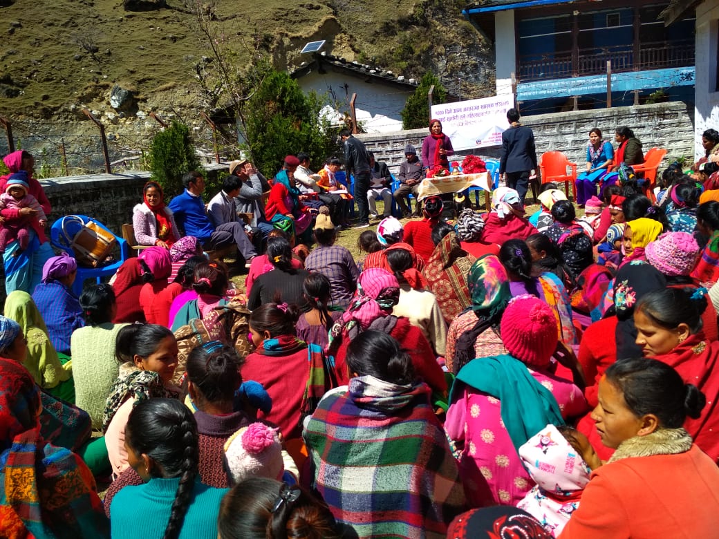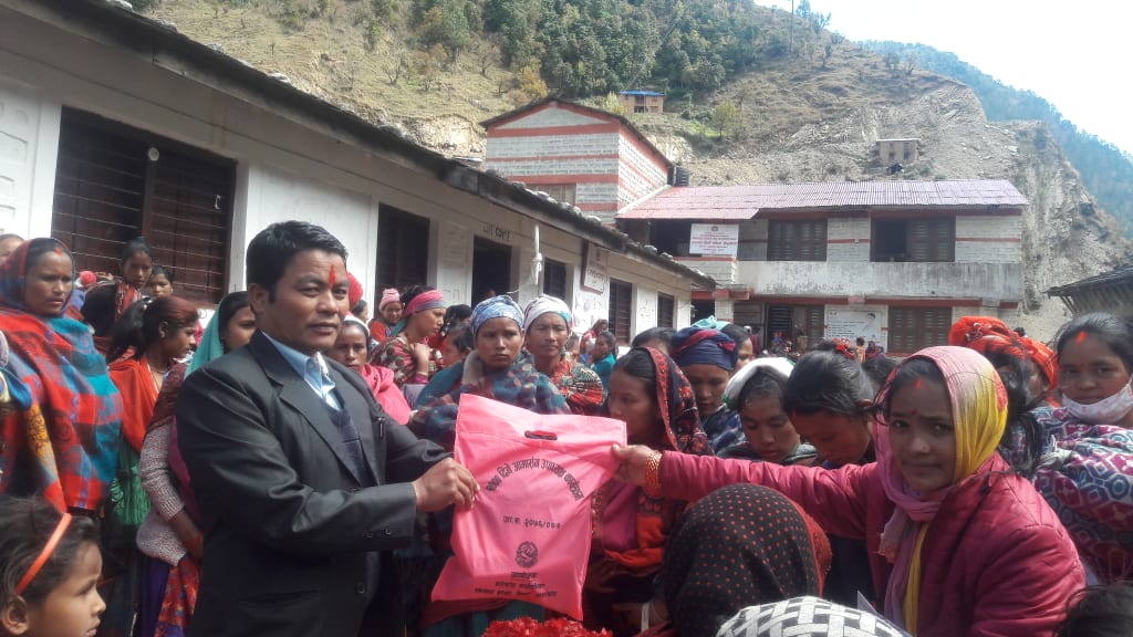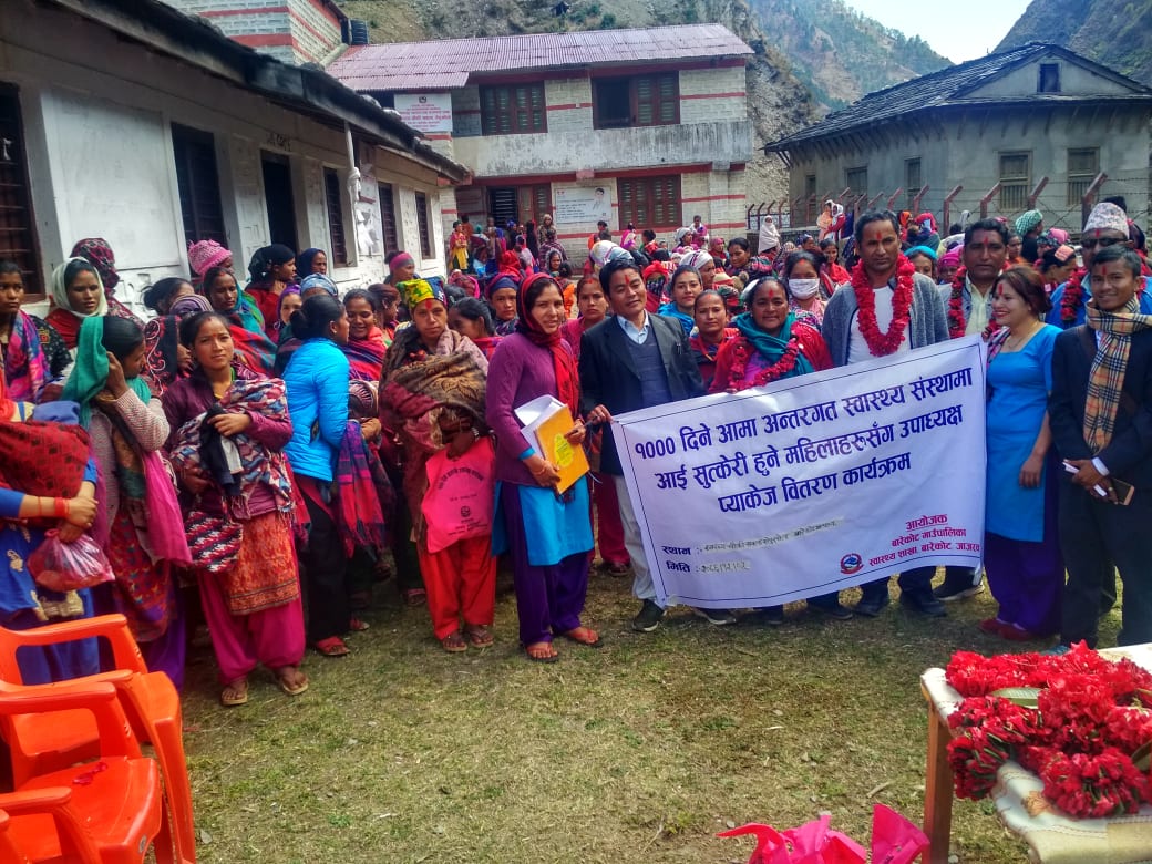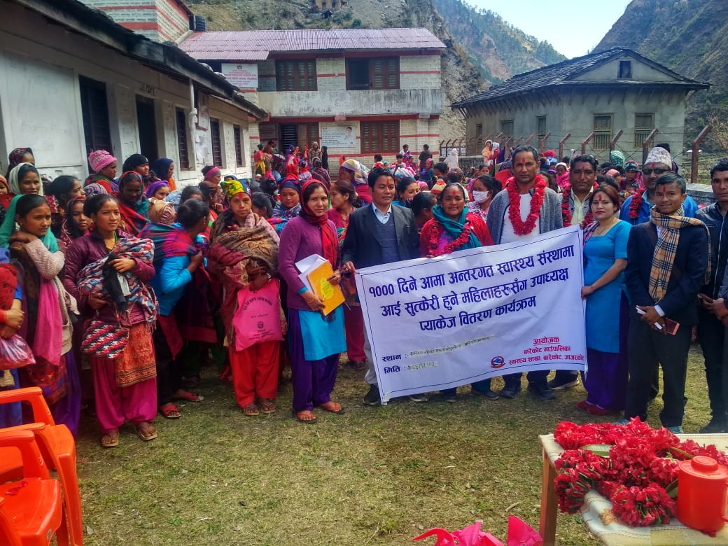 जाजरकोट , स्वास्थ्य संस्थामा आएर नियमित गर्भ जाँच गरी सुरक्षित सुत्केरी हुँने महिलाहरुलाई बारेकोट गाउँपालिका स्वास्थ्य शाखाद्धारा उपाध्यक्ष प्याकेज कार्यक्रमबाट बिभिन्न सामग्री पाएपछि सामुहिक तस्वीर लिदै गाउँपालिकाका उपाध्यक्ष ओमा शाही , प्रशासकीय अधिकृत गोविन्दबहादुर सिंह , स्वास्थ्य शाखा प्रमुख बीरराज सिंह र सुत्केरी महिलाहरु । तस्वीर हेमन्त केसी रासस