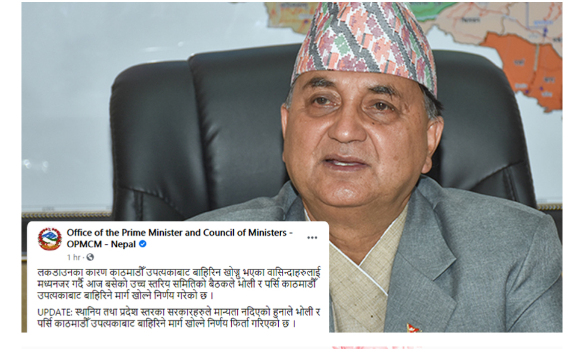 प्रधानमन्त्री कार्यालयको आधिकारिक फेसबुक पेजमा भोलि र पर्सि उपत्यका बाहिर जाने दिने निर्णय भएको तर स्थानीय र प्रदेश सरकारहरुले नमानेकाले फिर्ता लिएको अपेडट गरिएको छ ।