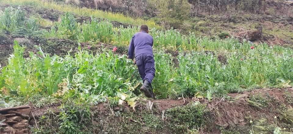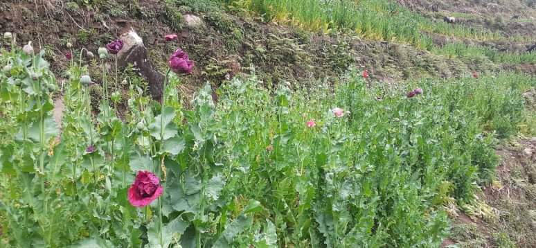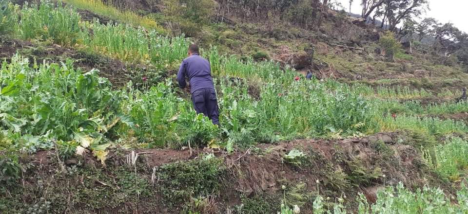 जाजरकोट कुशे गाउँपालिका – ८ नयाँबस्ती स्थित स्थानीयवासीले १ रोपनी जग्गामा लगाएको अफिम खेति नष्ट गदै प्रहरी । तस्वीर जिल्ला प्रहरी कार्यालय , जाजरकोट