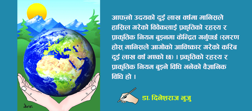 त्यसो भए कोभिड–१९ को कहरबीच पृथ्वी दिवसको सन्देश के हुनसक्छ रु सन्देश धेरै होलान् तर अहिले तीनवटा बँुदामा यसलाई अथ्र्याउन सकिन्छ । पहिलो सन्देश हो, मानिसलाई प्रकृति चाहिने हो, प्रकृतिलाई मानिस चाहिएको होइन । पृथ्वीसित मानिसले सम्झौता होइन, स्वीकार गर्नुपर्छ कि प्रकृतिमा मानिसको हैसियत एउटा सामान्य प्राणी हो, सर्वश्रेष्ठ भन्ने सिकाइ गलत रहेछ । आफ्नो उदयको दुई लाख वर्षमा मानिसले हासिल गरेको विवेकलाई प्रकृतिको रहस्य र प्राकृतिक नियमहरू बुझ्नमा केन्द्रित गर्नुपर्छ (स्मरण होस् मानिसले आगोको आविष्कार गरेको करिब दुई लाख वर्ष भएको छ) । प्रकृतिको रहस्य र प्राकृतिक नियमहरू बुझ्ने विधि भनेको वैज्ञानिक विधि हो । अर्थात् आफ्नो निष्कर्षमाथि प्रश्न, सन्देह र लगातारको अनुसन्धान क्रियाशीलता । यसकारण, राज्यहरूको प्राथमिकता वैज्ञानिक अनुसन्धान, प्रविधि विकास र नवप्रवर्तनमा हुनुपर्दछ ।