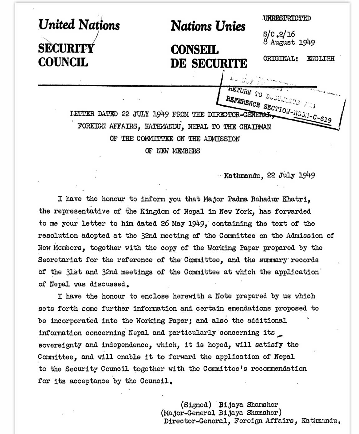 न्युयोर्क ः नेपालले सन् १९५५ डिसेम्बर १४ मा संयुक्त राष्ट्रसंघमा सदस्यता पाएको हो। नेपालले सन् १९४९ मा सदस्यताका लागि आवेदन दिएको भए पनि तत्कालीन सोभियत संघको कारण नेपालले सदस्यता पाउन ६ वर्ष संघर्ष गर्नुपरेको थियो। राणाकालीन अवस्थामै पठाइएको उक्त पत्रमा तत्कालीन डाइरेक्टर जनरल (परराष्ट्रमन्त्रीको हैसियत) को रूपमा विजयशमशेर राणाले तत्कालीन मेजर पदमबहादुर खत्रीलाई प्रतिनिधिका रूपमा पठाएका थिए। मोहनशमशेर प्रधानमन्त्री रहँदैमा उक्त प्रक्रिया अघि बढेको थियो। नेपालले सदस्यता प्राप्त गर्दा राजा त्रिभुवनकै प्रत्यक्ष शासन थियो।