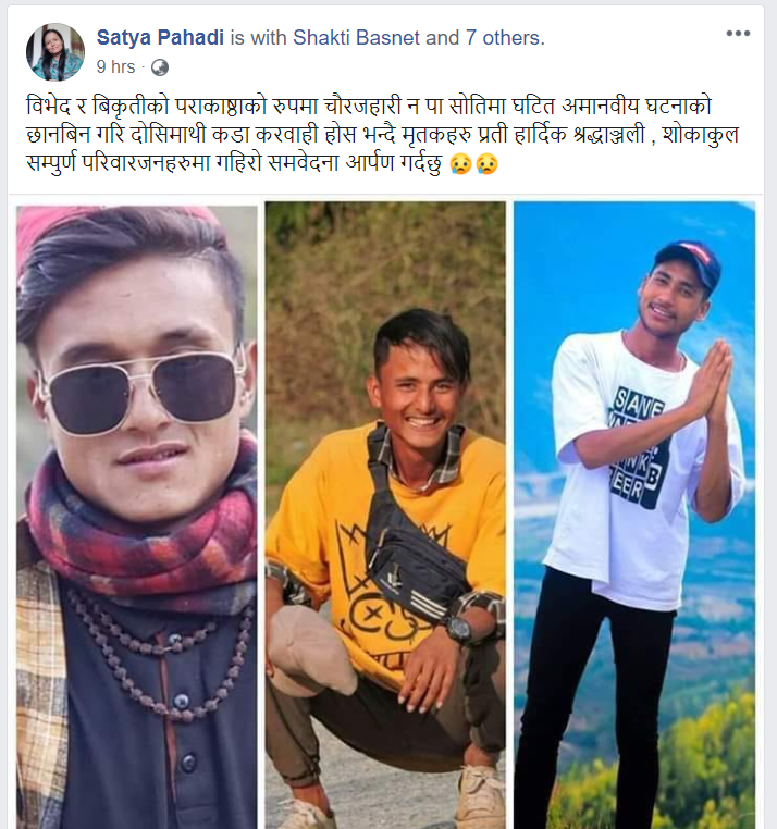 रुकुम पश्चिम चाैरजहारी न पा मा विवाह संग सम्बन्धित विषयलाई लिएर भएकाे घट्नाले सबैलाई स्तब्ध बनाएकाे छ । मृतकहरु नबराज बिक, गणेश बुढामगर र टिकाराम सुनार प्रति श्रध्दाञ्जली ब्यक्त गर्दछु र शाेक सन्तप्त परिवारजन लगायत सबैमा हार्दिक समवेदना प्रकट गर्दछु।नेपाल प्रहरी लगायत सम्बन्धित निकायहरुकाे तर्फबाट तदारुकताका साथ उक्त घट्नाकाे अध्ययन र अनुसन्धान कार्य भईरहेकाे छ।विश्वास गराैं , घट्नाकाे उचित छानविन सहित दाेषिहरुलाई कारवाही हुनेछ। अनुसन्धान प्रक्रियालाई प्रभावकारी बनाउन सबैले सहयाेग गराैं।