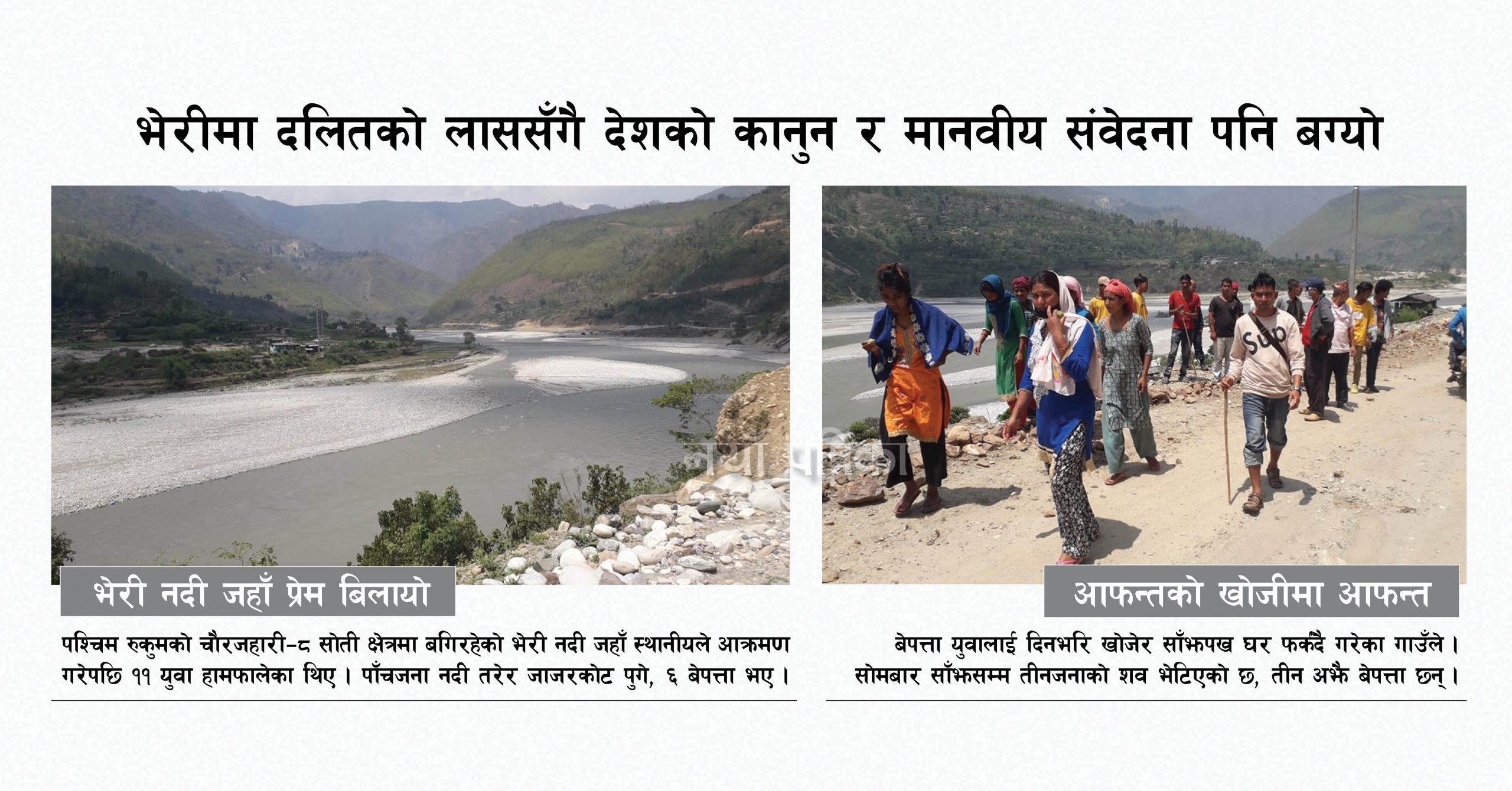 नेपालको कानुनले प्रत्येक व्यक्तिको मानवीय मर्यादा मात्र होइन, विवाह गर्ने र बरवधु छान्ने अधिकार पनि सुरक्षित गरेको छ, तर पश्चिम रुकुममा कथित माथिल्लो जातकी प्रेमिकालाई बिहे गर्न जाजरकोटबाट आएका युवाको समूहलाई ढुंगामुढा गरेर लखेटियो, ज्यान बचाउन भेरीमा हामफालेका तीनजनाको शव भेटियो, तीन अझै बेपत्ता
