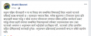 घटनाका विषयमा वन तथा वातावरणमन्त्री शक्तिबहादुर बस्नेतले श्रदान्जलि व्यक्त गदै यस्तो लेख्नुभएको छ ।