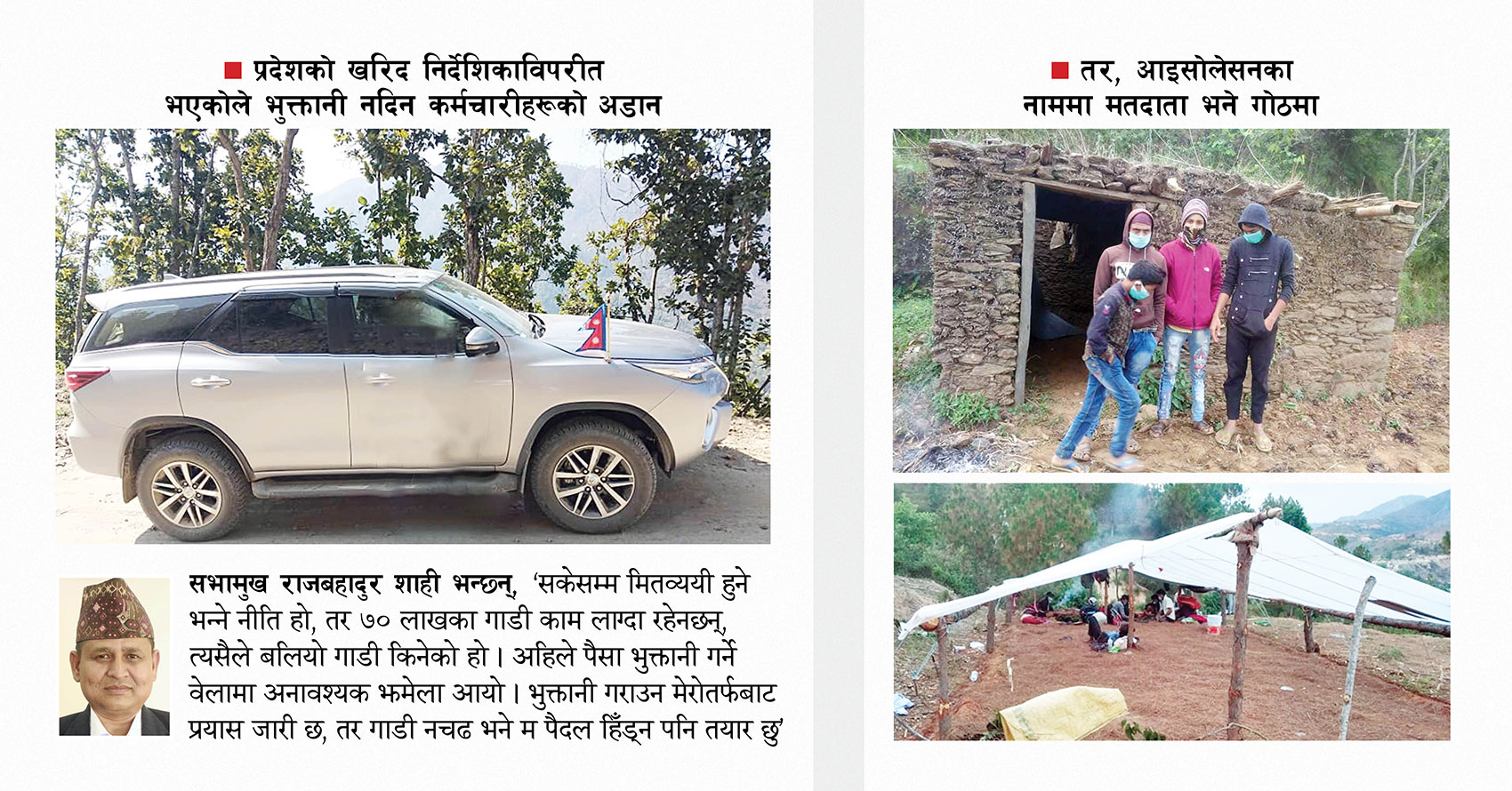 तर, सभामुख शाही भन्छन्, ‘सकेसम्म मितव्ययी हुने भन्ने नीति हो, तर ७० लाखका गाडी काम लाग्दा रहेनछन्, त्यसैले बलियो गाडी किनेको हो । अहिले पैसा भुक्तानी गर्ने वेलामा अनावश्यक झमेला आयो । भुक्तानी गराउन मेरोतर्फबाट प्रयास जारी छ, तर गाडी नचढ भने म पैदल हिँड्न पनि तयार छु । ’