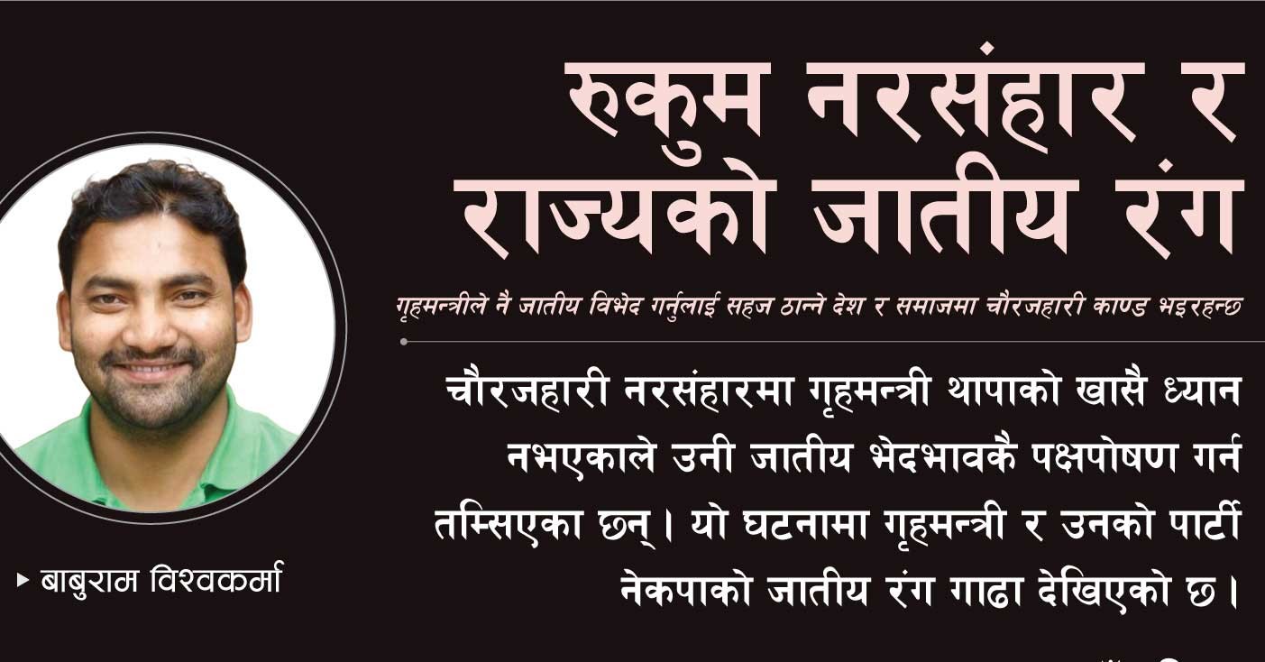 हुन पनि गृह प्रशासनकै लाचारीले गर्दा १० जेठमा रुकुमको चौरजहारीमा दलित युवा नवराज विश्वकर्मासहित ५ युवाको जातीय कारणले कुटीकुटी हत्या गरियो र एकजनालाई बेपत्ता बनाइयो भन्ने स्पष्ट भइसकेको छ । त्यो नरहत्यामा गृहमन्त्री थापाको पार्टी नेकपाका स्थानीय कार्यकर्ता र वडाध्यक्षसहितको संगठित समूह नै संलग्न छ । जातका आधारमा गरिएको ५ किशोरको सामूहिक हत्याको नैतिक जिम्मेवारी गृह प्रशासनकै हो । शान्ति–सुरक्षा कायम गर्न, झडप र हत्या रोक्न नसक्नु अनि हत्यापछि पनि अभियुक्तलाई कारबाही गर्न तदारुकता नदेखाउनुको कारण के हो रु मानवता नै लज्जित भएको जातीय नरसंहारमा सरकारले गल्ती र लज्जा महसुस गर्ने अनि पीडितलाई न्याय दिनेतिर तदारुकता देखाएको छैन । चौरजहारी नरसंहारमा गृहमन्त्री थापाको खासै ध्यान छैन, त्यसैले उनी जातीय भेदभावकै पक्षपोषण गर्न तम्सिएका छन् । यो घटनामा गृहमन्त्री र उनको पार्टी नेकपाको जातीय रंग गाढा देखिएको छ ।