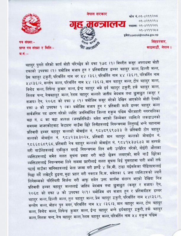 रुकुम पश्चिमको चौरजहारी नगरपालिका ८ सोतीमा जाजरकोटको भेरी नगरपालिका निवासी नवराज विकसहित ६ युवाको ज्यान जाने गरी भएको घटना वडाध्यक्ष डम्बरबहादुर मल्लको योजनामा भएको निचोड गृहमन्त्रालयले निकालेको छ। गत जेठ १० गते भएको उक्त घटना वडाध्यक्ष मल्लकै योजना हुन पुगेको ठहर गृहमन्त्रालयद्वारा गठित छानबिन समितिले गरेको छ। गृहका सहसचिव जितेन्द्र बस्नेत नेतृत्वको समितिले तयार प्रतिवेदनमा वडाध्यक्ष मल्लले चार गाउँका मानिस भेला पारेर युवाहरुमाथि आक्रमण गरी हत्यासम्म गरेको उल्लेख छ।