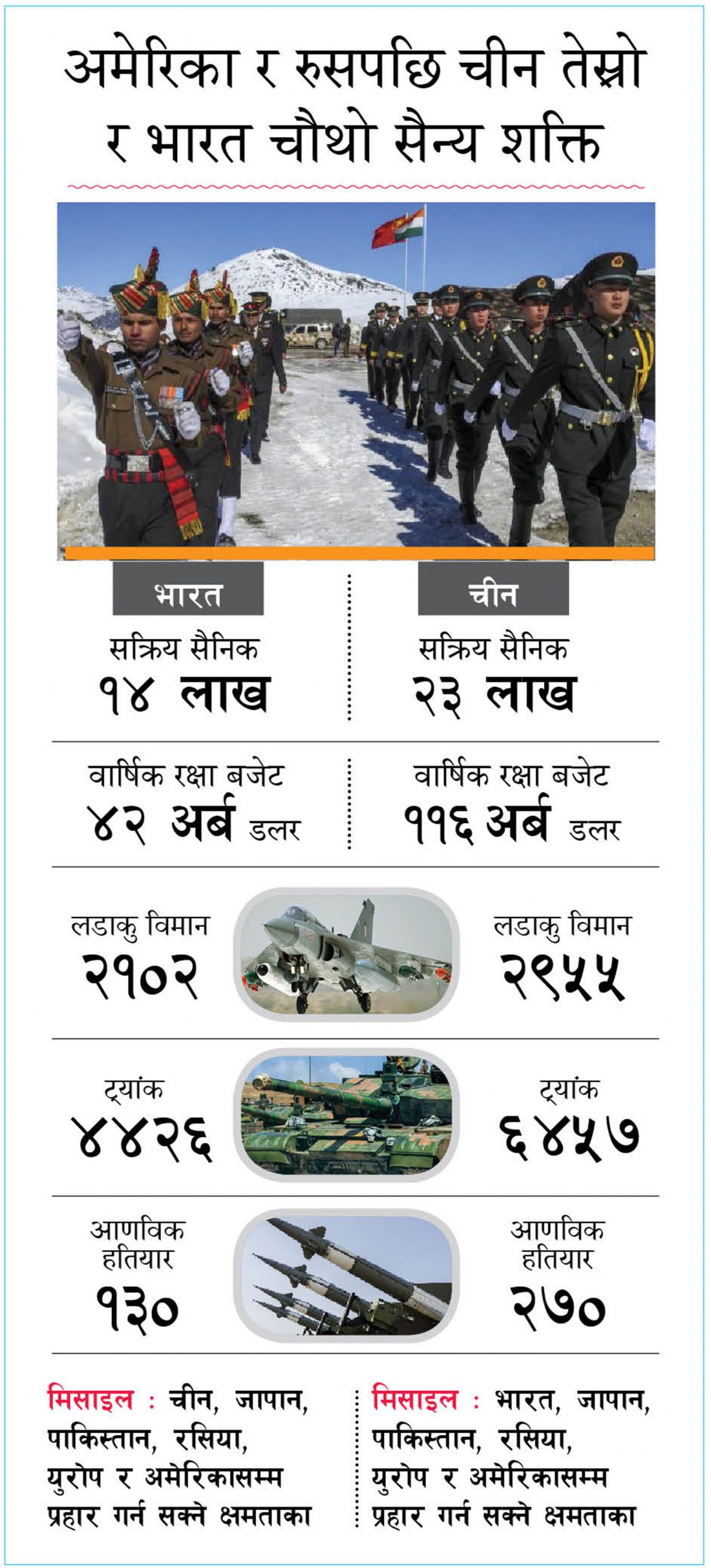 दुई ठूला छिमेकी भारत र चीनका सैनिकबीच हिंस्रक झडप भएको छ । दुई देशको सीमा क्षेत्र लद्दाखमा सोमबार राति भएको झडपमा भारतीय सेनाका कर्णेलसहित २० भारतीय सैनिकको मृत्यु भएको छ । जनसंख्याको हिसाबले विश्वको पहिलो र दोस्रो तथा परमाणु शक्ति सम्पन्न दुई उदाउँदा शक्तिबीचको तनावले एसिया मात्र होइन, पूरै विश्व तरंगित भएको छ ।