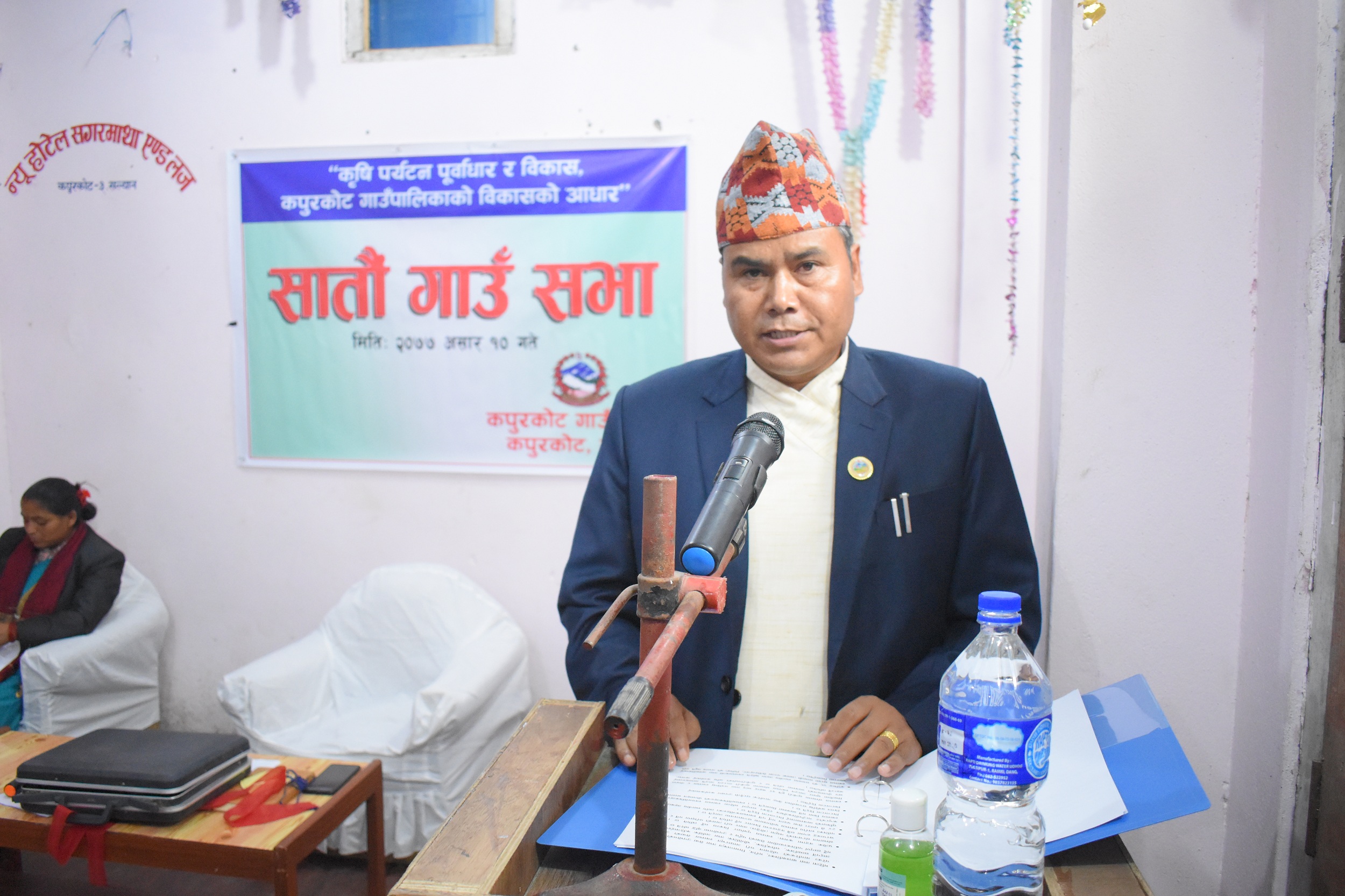 गाउँसभामा विधेयक समितिका संयोजक मिन बहादुर सेनले स्थानीय वन ऐन २०७७ र गाउँपालिकाको आर्थिक तथा विनियोजन ऐन पेश गरेका छन् । गाउँसभाका सदस्यहरुले प्रस्तुत नीति, कार्यक्रम र पेश भएको ऐनमाथी छलफल गरेर केही सुझावहरु प्रदान गरेका थिए । कपुरकोट गाउँपालिकाको सातौँ गाउँसभाको पहिलो बैठक विहिबारलाई स्थतीत भएको छ । दोश्रो बैठक आगामी असार १८ गते तय भएको छ । उक्त बैठकबाट आगामी आर्थिक वर्षको नीति, कार्यक्रम तथा बजेट र पेश भएका ऐन पारित गर्ने कार्यतालिका रहेको प्रमुख प्रशासकीय अधिकृत भण्डारीले जानकारि दिए ।