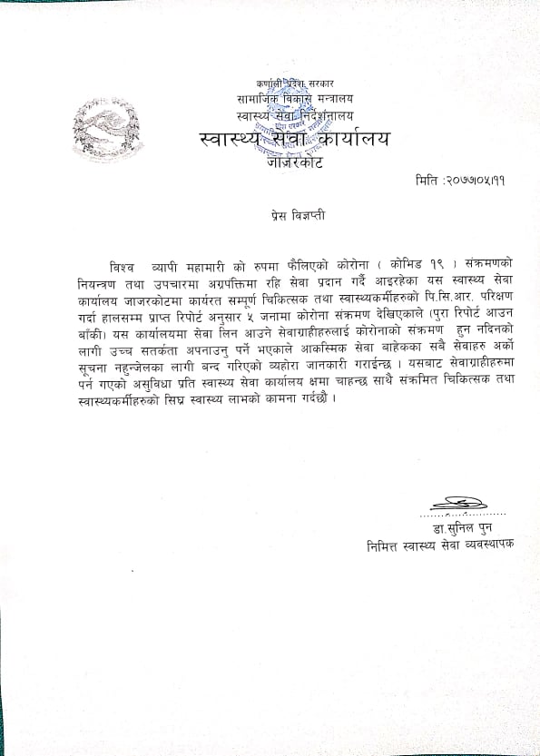 त्यस्तै डिभिजन वन कार्यालयका कर्मचारीलाई पनि कोरोना संक्रमण देखिएको छ । एक हप्ताका लागि भेरी नगरपालिका ३–४ मा निषेधाज्ञा जारी गरिएको छ ।