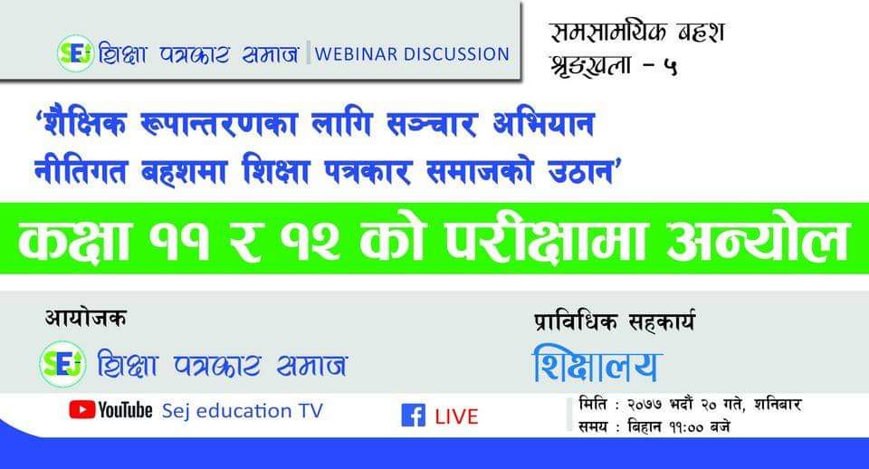 शिक्षा पत्रकार समाज (सेज) ले आज आयोजना गरेको भर्चुअल बहसमा बोर्डका अध्यक्ष प्रा डा चन्द्रमणि पौडेलले विद्यार्थीले संसारभरि लिएर जान सक्ने विधिवत् लब्धाङ्कपत्र प्राप्तिको सवाललाई गम्भीरताका साथ आफूहरुले अध्ययन गरिरहेको जनाउनुभयो । उहाँले कक्षा १२ को परीक्षालाई यसअघि असोजको पहिलो साताबाट सञ्चालन गर्ने तयारी गरिएकामा कोरोना भाइरसको जोखिम बढेकाले मिति पछि सर्न सक्ने र यसबारे बोर्डले मात्रै निर्णय गर्न नसक्ने स्पष्ट गर्नुभयो ।