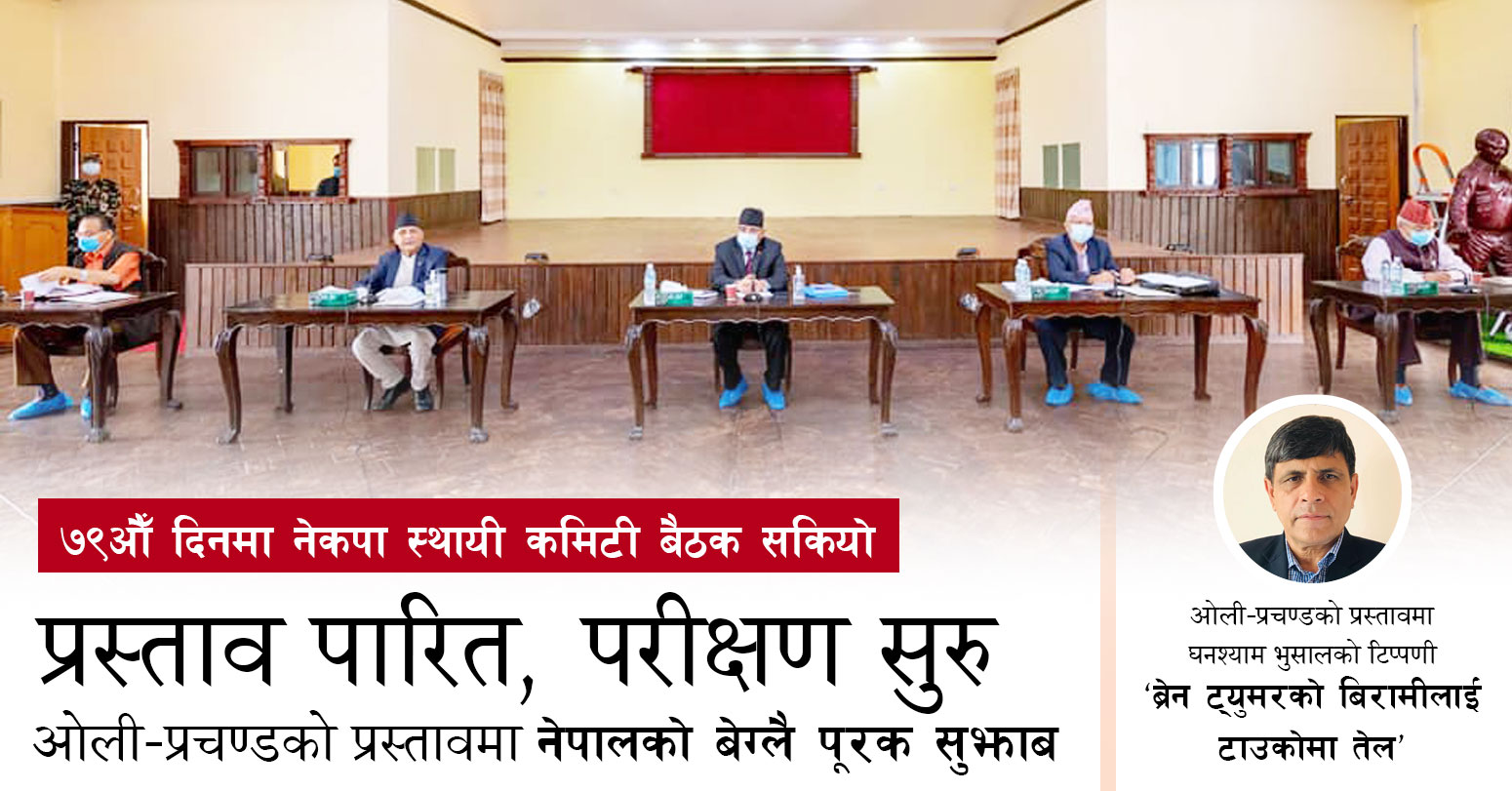 विभाजनको ढिलमै पुगेर दुर्घटनाबाट बचेको नेकपाले सर्वसम्मतिमा १५बुँदे प्रस्ताव पारित गर्दै शुक्रबार स्थायी कमिटी बैठक सकेको छ । पार्टी एकतालाई बलियो बनाउने सैद्धान्तिकसहितका प्रस्ताव पारित गर्दै ७९ दिनमा बैठक सकिए पनि यससँग जोडिएका अन्य प्रस्ताव कार्यान्वयनको परीक्षण भने सुरु भएको छ । स्थायी कमिटी बैठकबाट पारित प्रस्ताव कार्यान्वयनको अवस्थाले नेकपा विवादको दिशा र दशा तय गर्नेछ । तर, तत्कालका लागि राजनीतिक दुर्घटनाबाट भने नेकपा बचेको छ ।