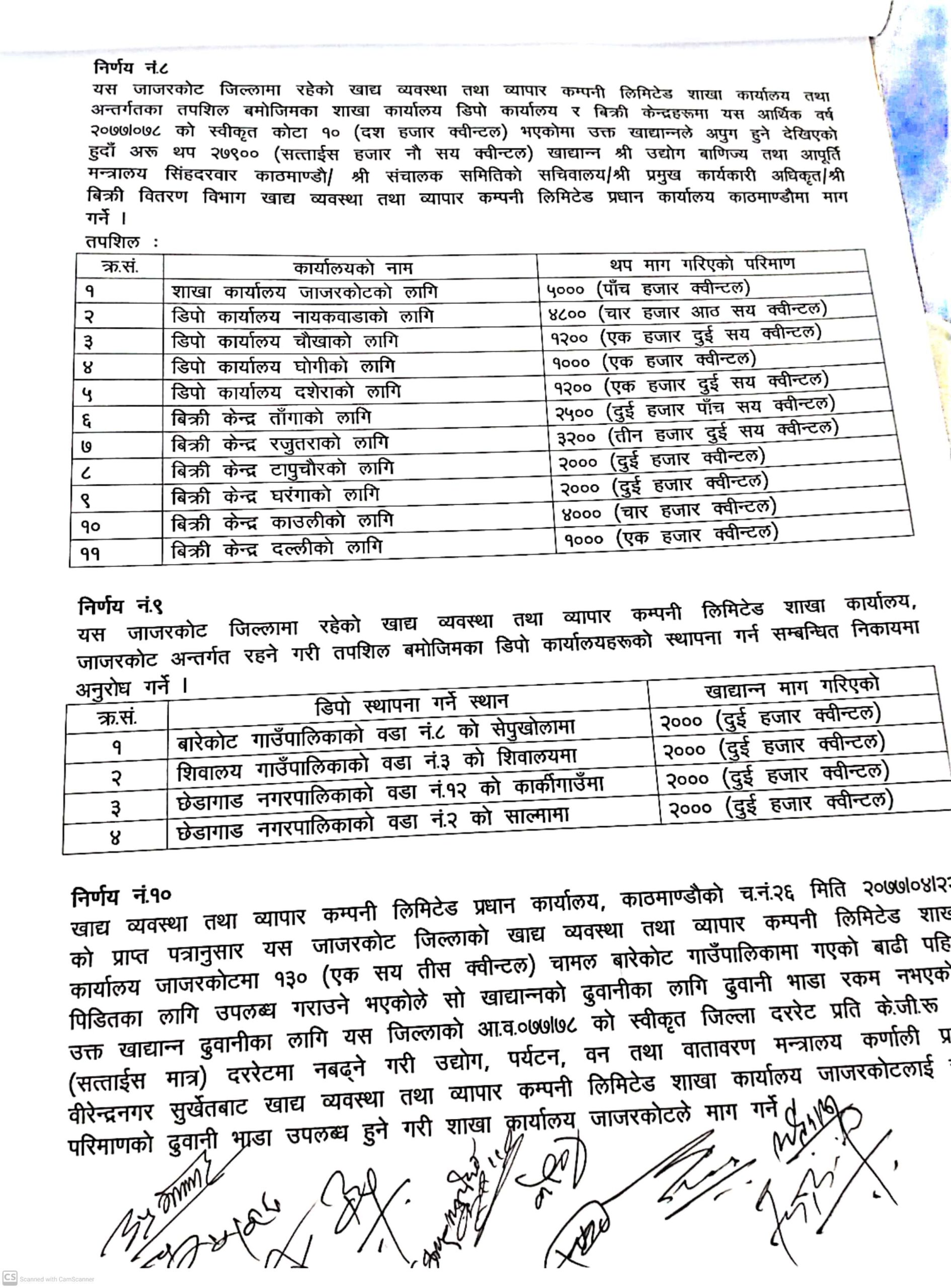 पुर्वको बारेकोट गाउँपालिका ८ सेपखोलामा २ हजार क्वीन्टल चामल सहित नयाँ डिपो स्थापना गर्न कम्पनीलाइ माग गरिएको छ । पश्चिमको शिवालय गाउँपालिका ३ शिवालयमा २ हजार क्वीन्टल चामल , छेडागाड नगरपालिका १२ कार्कीगाउँमा २ हजार र छेडागाड २ साल्मा २ हजार चामलको कोठा सहित डिपो स्थापना गर्न माग गरिएको प्रजिअ बरालले जानकारी दिनुभयो ।