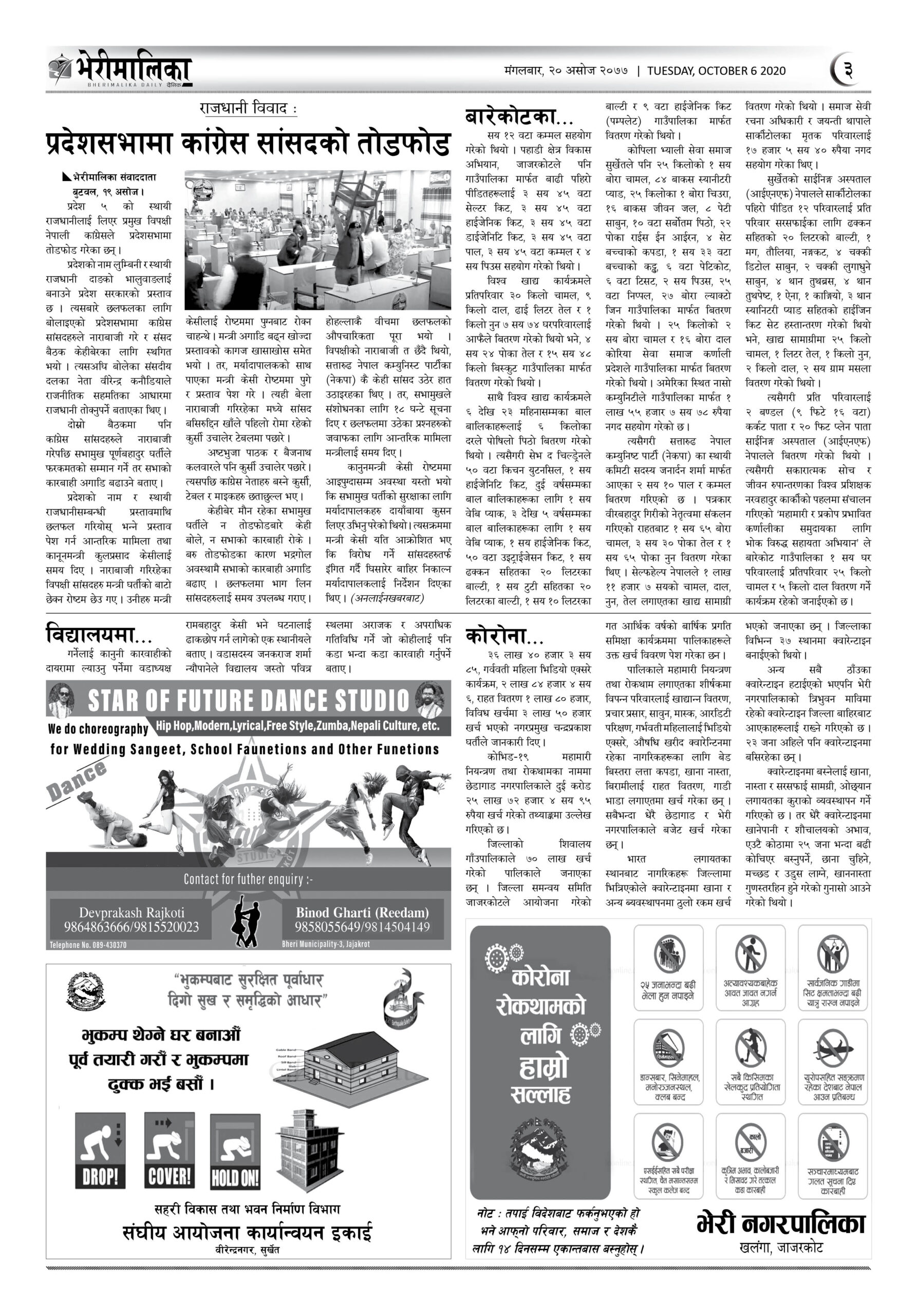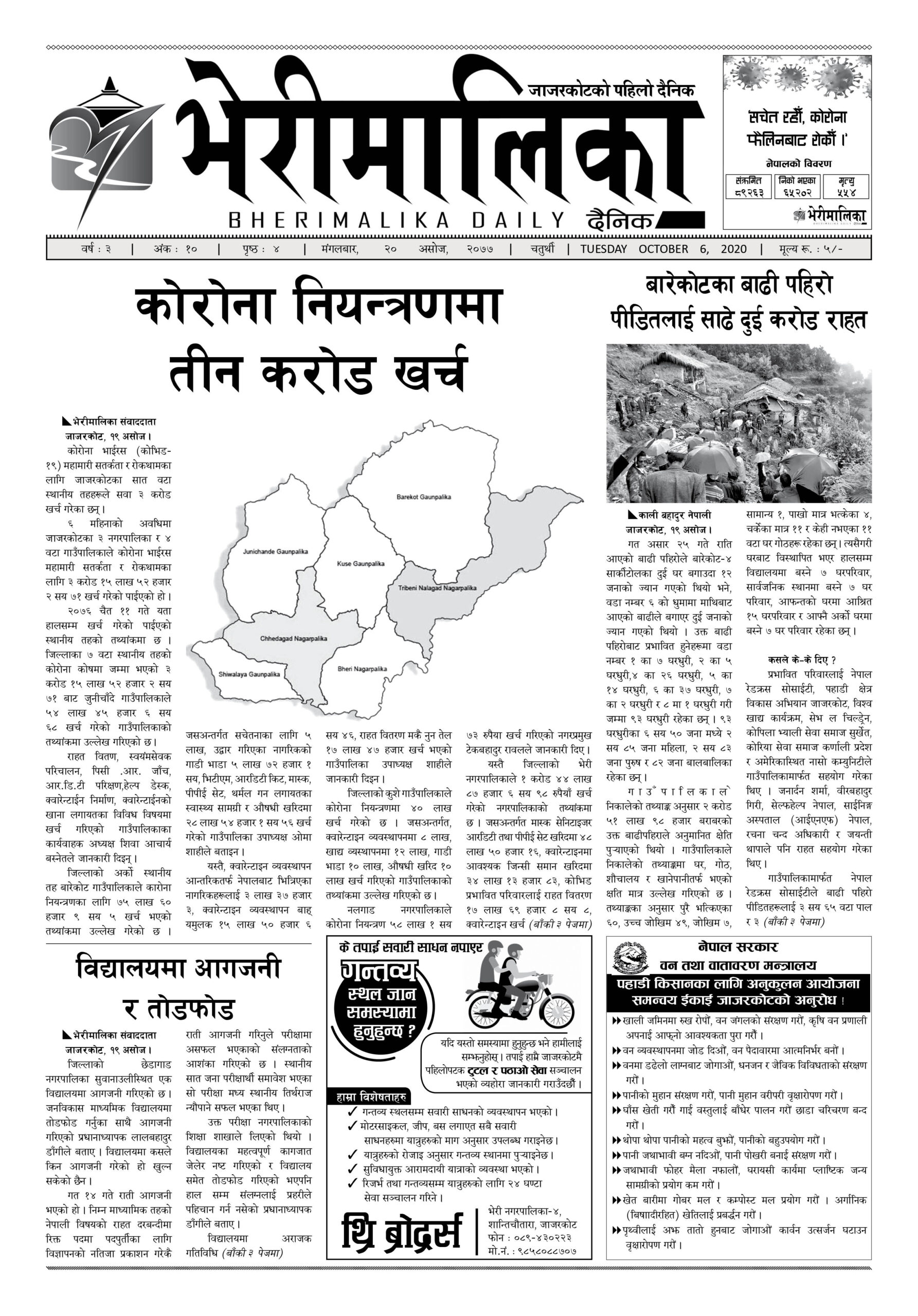 भेरी नगरपालिका २० असोजमा के छापियो ? नेपालपोष्ट खबर । २० आश्विन २०७७, मंगलवार ०६:५९ मा प्रकाशित Share this: Share on X (Opens in new window) X Share on Facebook (Opens in new window) Facebook