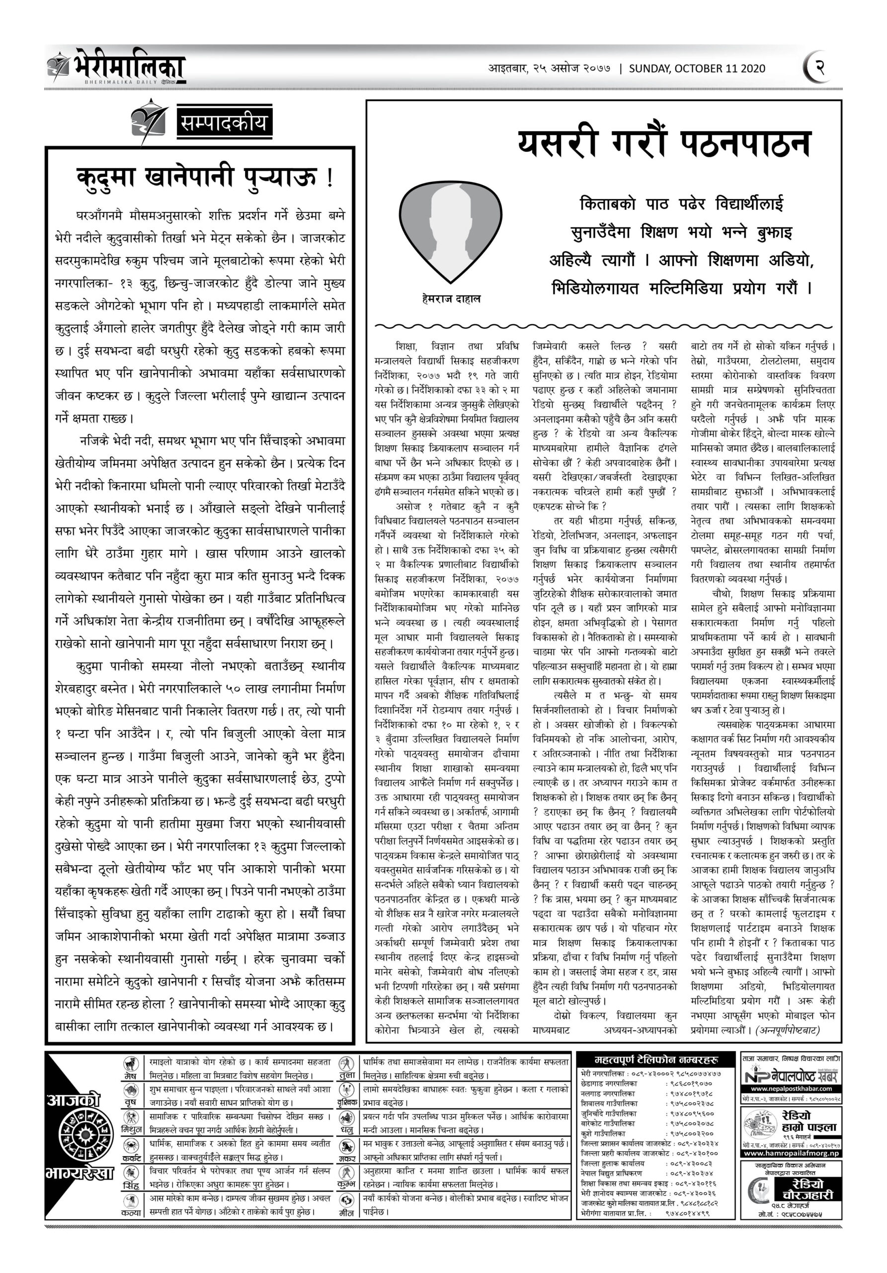 भेरीमालिका दैनिक असोज २५ मा के छापियो ? नेपालपोष्ट खबर । २५ आश्विन २०७७, आईतवार ०६:३७ मा प्रकाशित Share this: Share on X (Opens in new window) X Share on Facebook (Opens in new window) Facebook