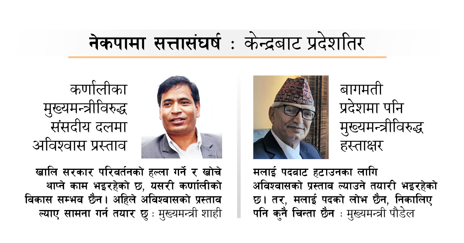 नेकपामा सत्तासंघर्ष ः केन्द्रबाट प्रदेशतिर कर्णालीका मुख्यमन्त्रीविरुद्ध संसदीय दलमा अविश्वास प्रस्ताव, बागमती प्रदेशमा पनि मुख्यमन्त्रीविरुद्ध हस्ताक्षर