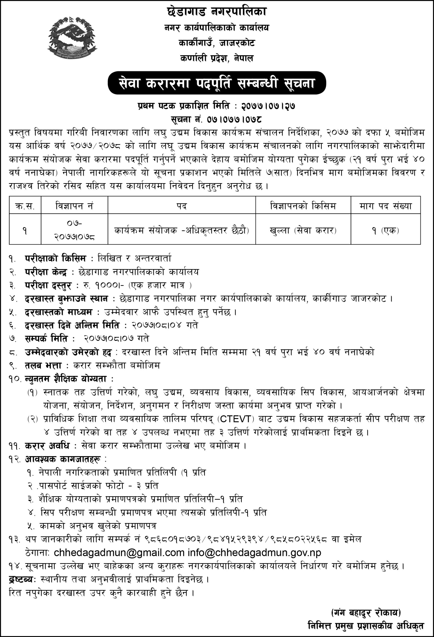 छेडागाड नगरपालिकामा रोजगारीका लागि यस्तो छ अवसर नेपालपोष्ट खबर । २७ कार्तिक २०७७, बिहीबार ०९:५४ मा प्रकाशित Share this: Share on X (Opens in new window) X Share on Facebook (Opens in new window) Facebook