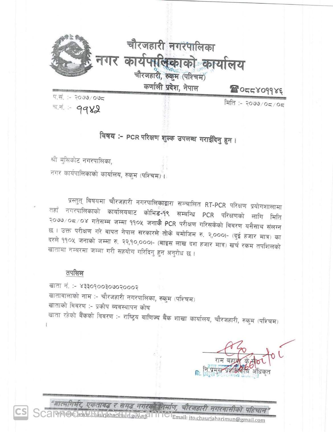 चौरजहारी नगरपालिकाका प्रमुख प्रशासकीय अधिकृत रामबहादुर केसीले सरकारले तोकेको मापदण्ड अनुसार रकम दिनुपर्ने बताए । सरकारले नै तोकेको पैसा मागेको हो अरु होइन , अव नयाँ स्वाबको प्रतिव्यक्ति रु १ हजार वुझाएपछि मात्र परीक्षण हुँने बताउनुभयो । कर्णाली प्रदेश सरकारले मेसिन खरिदका लागि मात्र पैसाँ पठाएको तर स्वाब परीक्षणका लागि भएको खर्च नपठाएको उहाँले बताउनुभयो ।