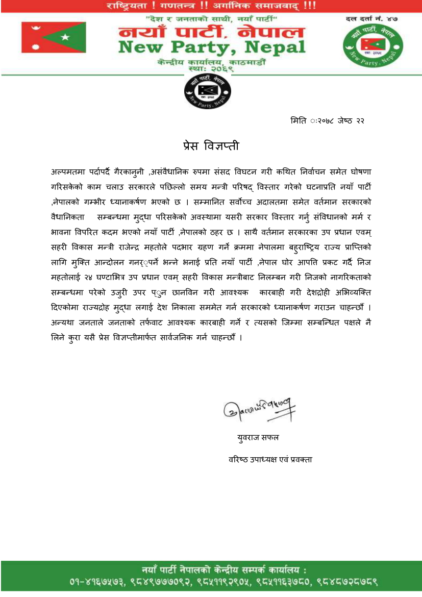 शनिबार नयाँ पार्टी, नेपालले कामचलाउ सरकारमा सहभागी भइ उच्च ओहदामा आसिन महतोलाई देश निकाला गर्नुपर्ने माग राखेको हो ।