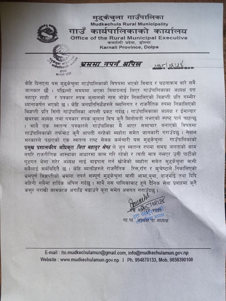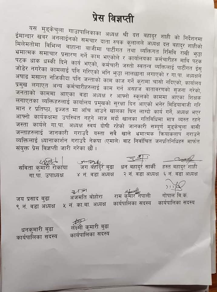 यता उपाध्यक्षलगायत अन्य जनप्रतिनिधिले अछापे विज्ञप्ति जारी गरी मिडियालाईसमेत गाली गर्दै अध्यक्ष र पत्रकार मिलेर गाउँपालिकामा काम गर्ने वातावरण बिगारेको आरोप लगाएको छ।