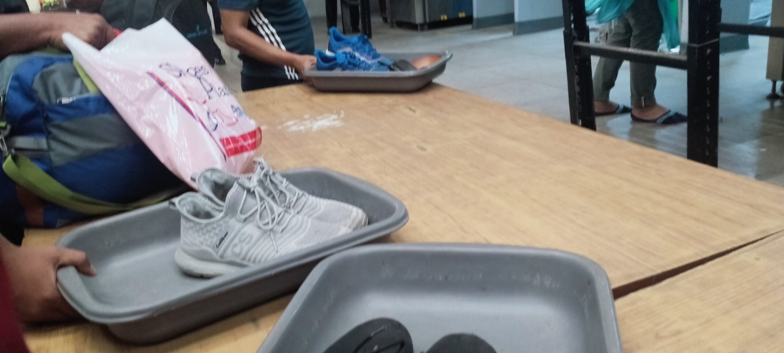 यात्रुहरुको जुत्ता, बेल्ड र पर्स समेत निकालेर पलाष्टिकको भाडामा राखी खाली खुट्टा हिडाएर जाँच गरिदै