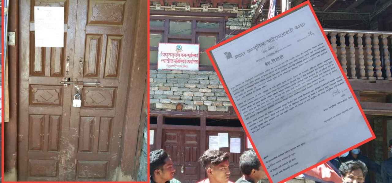 डोल्पा- नेपाल कम्युनिस्ट पार्टी माओवादी केन्द्रले सूचना प्राविधि अधिकृत पुर्नवहालीको माग राख्दै त्रिपुरासुन्दरी नगरपालिका कार्यालयको मुलगेटमा तालाबन्दी गरेको छ ।