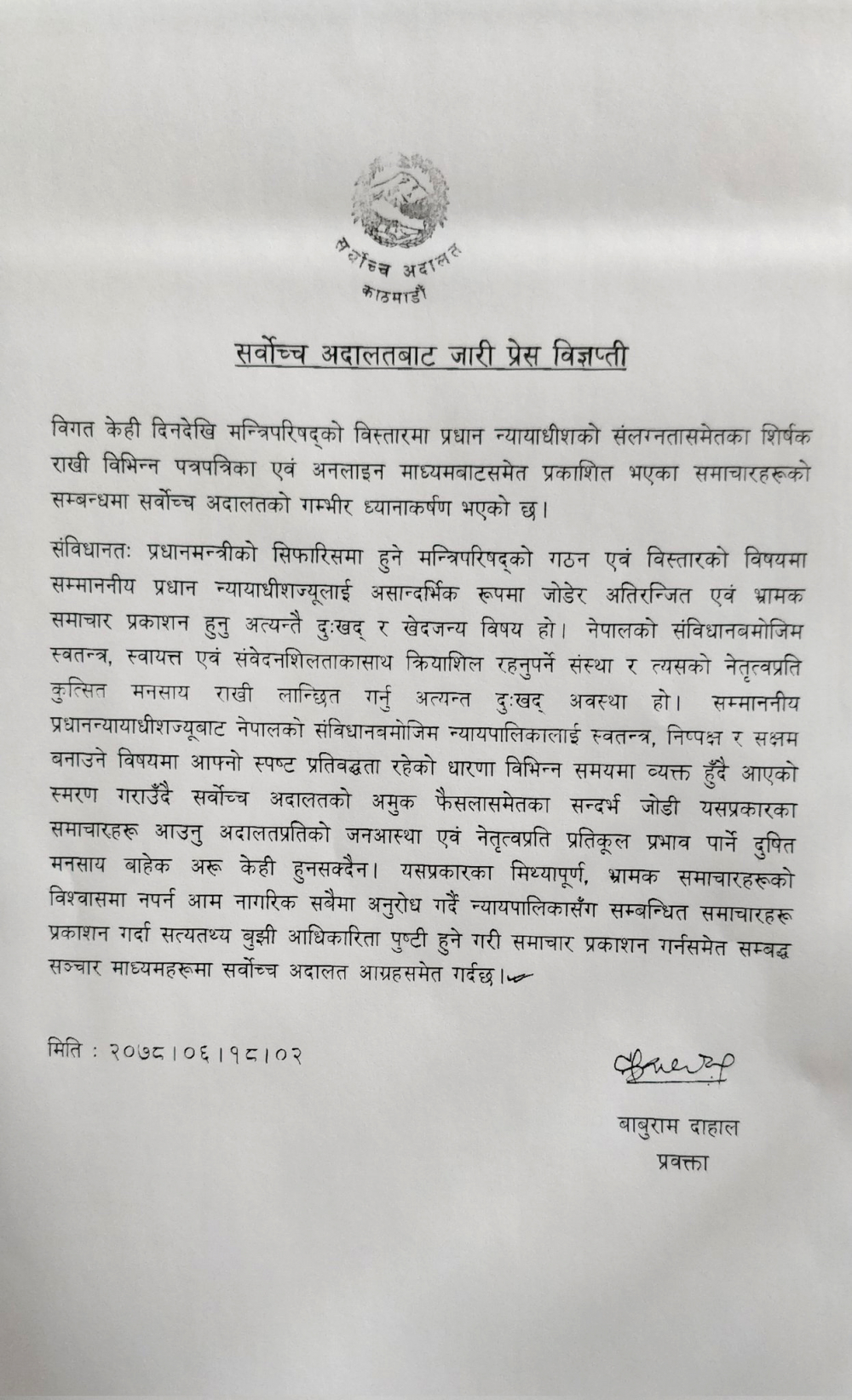 त्यस्तै नेपालको संविधानबमोजिम न्यायपालिकालाई स्वतन्त्र, निष्पक्ष र सक्षम बनाउने विषयमा प्रधानन्यायाधीश स्पष्ट प्रतिबद्ध रहेको उल्लेख गर्दै विज्ञप्तिमा सर्वोच अदालतप्रतिको जनआस्था र नेतृत्वप्रति प्रतिकूल प्रभाव पार्ने दूषित मनसायले समाचार आएको जनाइएको छ ।