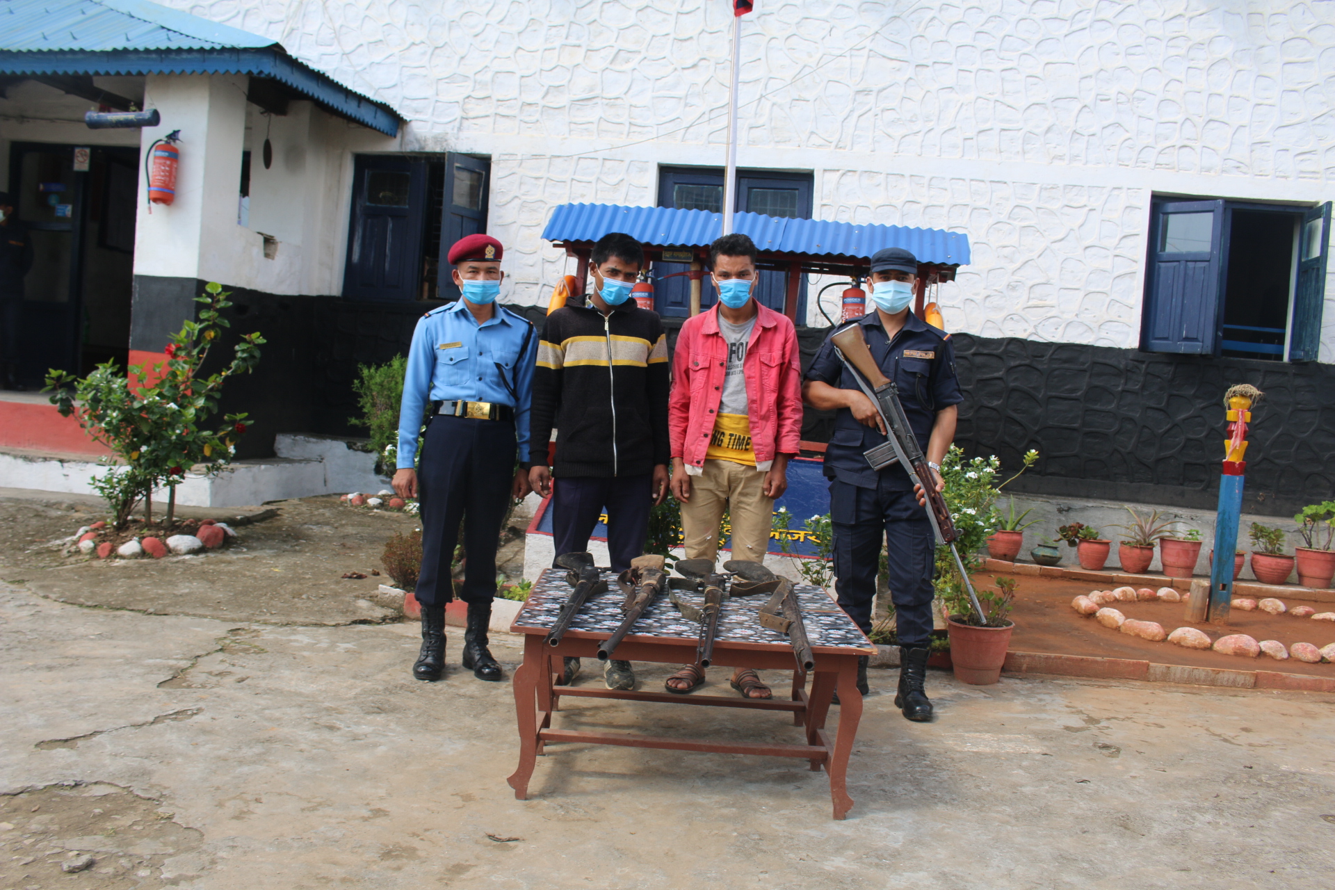जाजरकोट ः शिवालय गाउँपालिका –६ सुङ्गुरखाली रिसिनाका २९ बर्षीय नबिन शाही र २२ बर्षीय मनोज शाहीलाइ सिकार खेल्न जाँदै गर्दा ४ नाल भरुवा आज विहान प्रहरीले पक्राउ गरी सार्वजनिक गर्दै । तस्वीर जिप्रका ,जाजरकोट