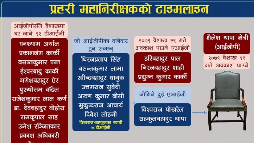 नेपाल प्रहरीको महानिरीक्षक पदमा अहिले शैलेश थापा क्षेत्री कार्यरत छन् । अहिलेसम्म संगठनभित्र इमान्दार छवि बनाएका क्षेत्री गृहमन्त्री र प्रधानमन्त्री कार्यालयको दोहोरो निर्देशनको कोपभाजनमा परेका छन् । जतिसुकै तनावमा परे पनि आगामी ०७९ बैशाख १९ गते महानिरीक्षक क्षेत्रीले अवकाश पाउनेछन् । त्यसपछि पनि नयाँ प्रहरी महानिरीक्षकमा पूर्वप्रधानमन्त्री केपी शर्मा ओलीकै ‘सेटिङ’ कायम रहने देखिन्छ ।