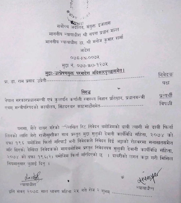 डा। रावललाई सहप्राध्यापक बनाउने प्रक्रिया नै गलत भएको भन्दै प्रा।डा। रामप्रसाद उप्रेतीले सर्वोच्च अदालतमा रिट दायर गरेका थिए । तर उनी आफैंले रिट फिर्ता लिन निवेदन दिएपछि २५ साउन २०७८ मा न्यायाधीश सपना प्रधान मल्ल र मनोजकुमार शर्माको इजलासले रिट फिर्ताको अनुमति दिएको थियो ।