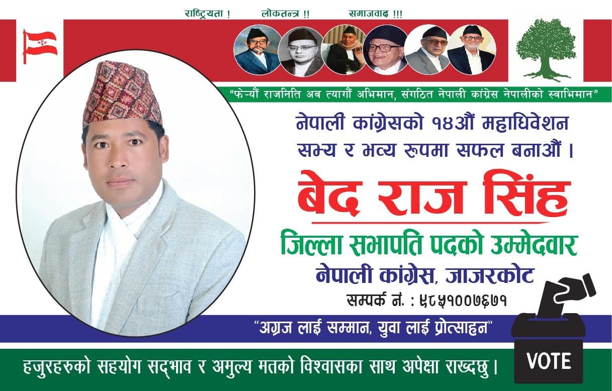 जाजरकोट ः नेपाली कांग्रेसका यूवा नेता वेदराज सिंहले जाजरकोट नेपाली कांग्रेसको सभापतिमा उम्मेदवारी घोषणा गरेका छन् ।