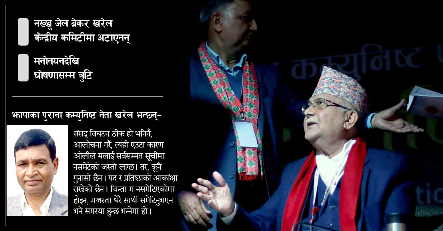 १७ वर्ष जेलजीवन बिताएका खरेल ०३३ मा सिपी मैनालीसँगै नख्खु जेल ब्रेक गर्ने जीवित इतिहास हुन् । तर, सर्वसम्मत नेतृत्व चयन गर्दा नवौँपछिका केन्द्रीय सदस्य दोहोरिने मापदण्ड तय भएको विश्वासमा उम्मेदवारी दिएका खरेल ओलीको सूचीमा अटाएनन् । त्यसरी सूचीमा नपर्नुका एक मात्र कारण ओलीले गरेको संसद् विघटनको आलोचना हुन सक्ने उनको बुझाइ छ ।