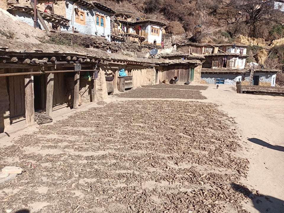 ठूलिभेरी नगरपालिका–६ डोल्पाका सर्वसाधारणले सामुदायिक वनबाट सङ्कलन गरी ल्याएको सेतक चिनी यहाँका सर्बसाधाणले बजारसम्म लानका लागि घाममा सुकाउँदै ।