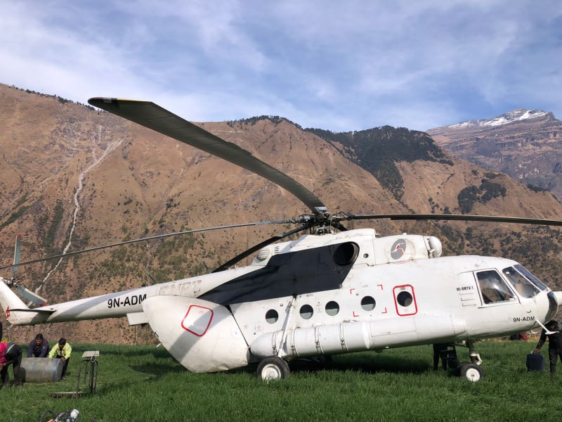 जाजरकोट / सडकको अस्थायी ट्याक खोल्नका लागि रुकुम पश्चिम आठबीसकोट नगरपालिकाले हेलिकोप्टरबाट डोजर ढुवानी गरिरहेको छ ।