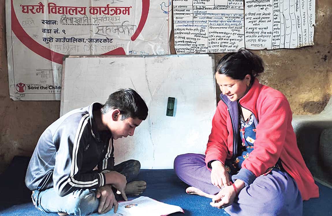 जाजरकोट ः जाजरकोटको कुशेमा विद्यालयको पहुँचमा पुग्न नसकेका शारीरिक अशक्तलाई घरमै पढाउने गरिएको छ। कुशे गाउँपालिका–८ मेलबिसाउनका शिवराज गिरी जन्मजात शारीरिक अपांगता भएका बालक हुन्। उनका खुट्टा चल्दैनन्। जसका कारण उनी उभिन र हिँडडुल गर्न समेत सक्दैनन्।