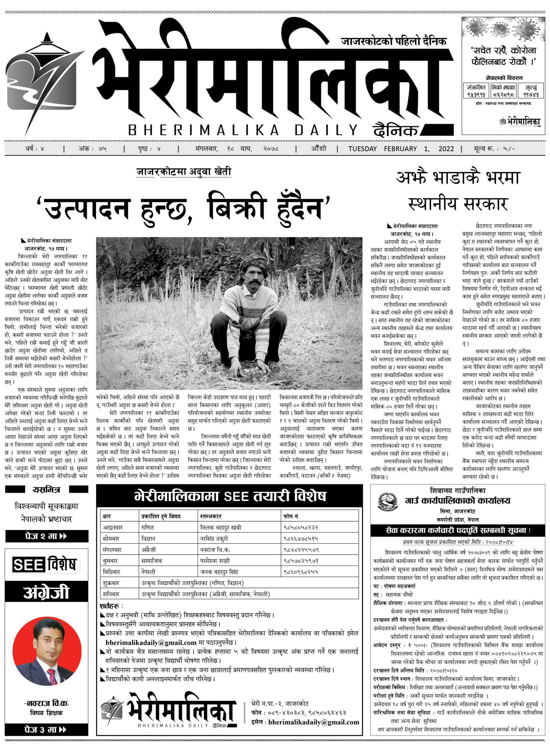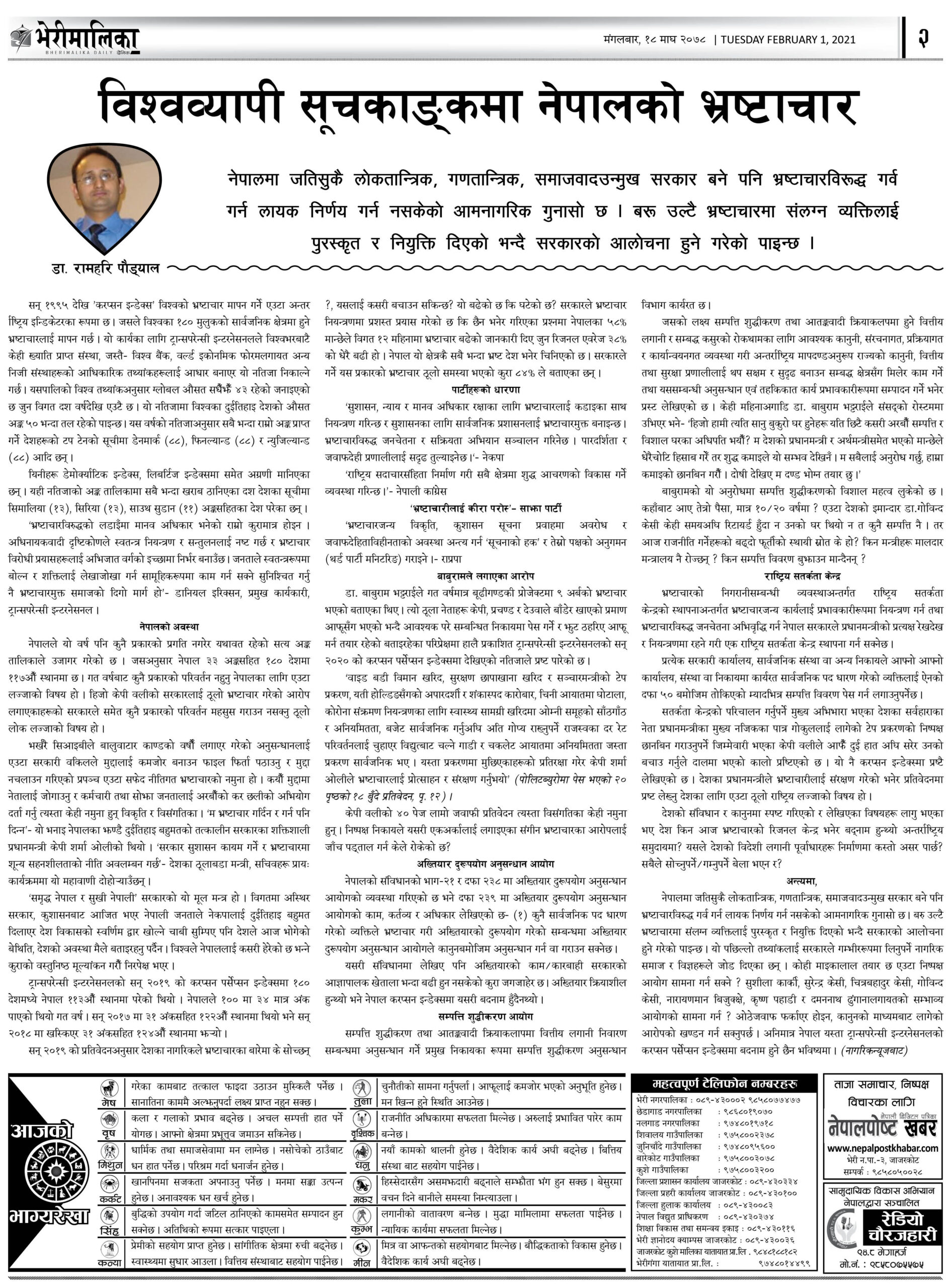 आजको भेरीमालिका दैनिकमा के छापियो ? नेपालपोष्ट खबर । १८ माघ २०७८, मंगलवार ०८:१३ मा प्रकाशित Share this: Share on X (Opens in new window) X Share on Facebook (Opens in new window) Facebook