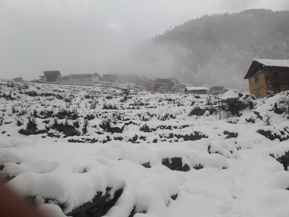 डोल्पा , २१ माघ ः भारी हिमपात भएपछि तल्लो डोल्पाको मुड्केचेला गाउँपालिकाको प्रशासकीय केन्द्र नर्कु सेताम्य भएको छ । आकाशे पानीको भरमा लगाएको अन्नबालीलाइ सहयोग पुगेको छ । तस्वीर दीर्घबहादुर शाही