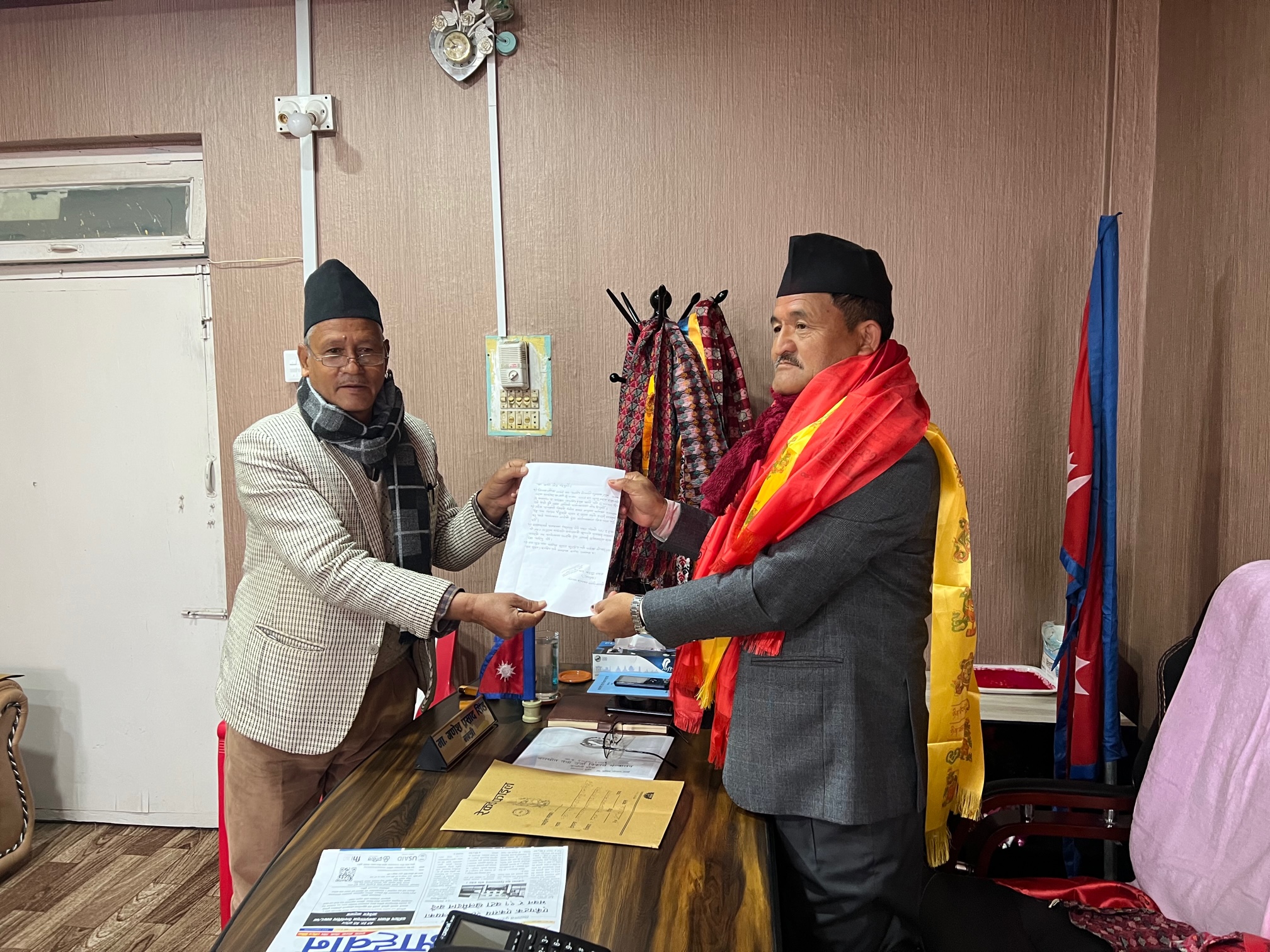 जाजरकोटमा खानेपानीको समस्याका बारेमा योजना माग गदै ज्ञापन पत्र पेश गर्नुहुँदै
