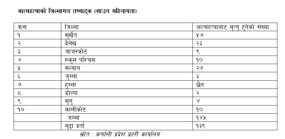 १० जिल्ला रहेको कर्णालीका अन्य जिल्लाभन्दा प्रदेश राजधानी समेत रहेको सुर्खेतमा आत्महत्याका धेरै घटना हुने गरेको प्रहरीको तथ्याङ्कले देखाउँछ । यस बाहेक दैलेख, सल्यान, कालीकोट, रुकुम पश्चिममा पनि आत्महत्या गर्नेको संख्या धेरै रहेको प्रदेश प्रहरी कार्यालयको तथ्याङ्कमा उल्लेख छ । सुर्खेतमा चालु आर्थिक बर्षमा हालसम्म ५७ जनाले आत्महत्याको बाटो रोजेका छन् । जिल्ला प्रहरी कार्यालय सुर्खेतका डीएसपी एवं सूचना अधिकारी रामप्रसाद घर्तीका अनुसार सुर्खेतमा विगतका ३ आर्थिक बर्षमा मात्रै ३४७ जनाले आत्महत्या गरेका छन् । जसमध्ये २१४ जना पुरुष तथा १३३ जना महिला रहेका छन् ।