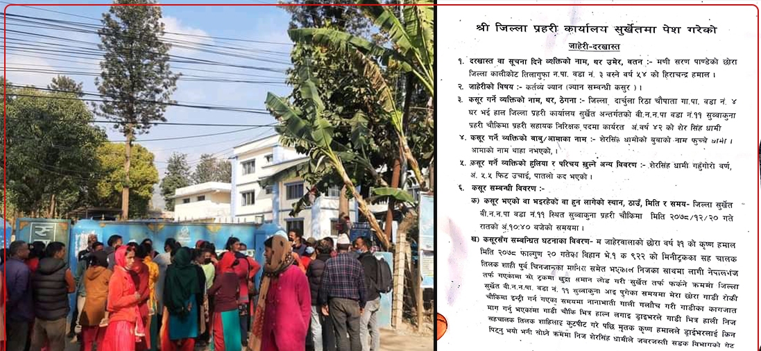 सुर्खेतमा कालिकोटका व्यापारी कृष्ण हमाल (मिनी) को शङ्कास्पद मृत्यु भएको घटनामा सुब्बाकुनाका प्रहरी सहायक निरिक्षक (असई) शेरसिंह धामीविरुद्ध कर्तव्य ज्यानसम्बन्धी कसुरमा किटानी जाहेरी दर्ता भएको छ । मृतक हमालका आफन्त तिलागुफा नगरपालिका–३ का ५४ वर्षीया हिराचन्द्र हमालले आइतबार दिउँसो जिल्ला प्रहरी कार्यालय सुर्खेतमा जाहेरी दर्ता गराएका हुन् ।