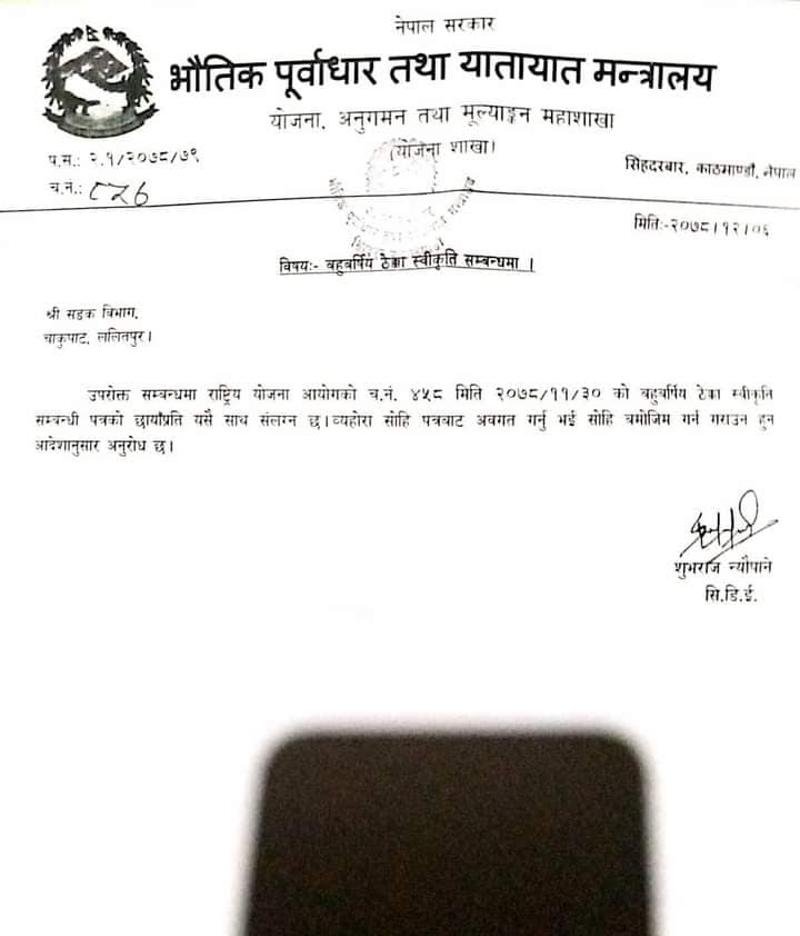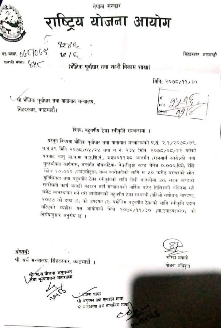 तत्काल ठेक्का खोजी काम गर्न भौतिक पूर्वाधार तथा यातायात विकास मन्त्रालय योजना अनुगमण तथा मुल्यांकन महाशाखाले सडक विभागलाइ पत्राचार गरेको छ । पूर्वमन्त्री तथा प्रतिनिधिसभा सदस्य शक्तिबहादुर बस्नेत र कर्णाली प्रदेशका जलस्रोत तथा उर्जा विकास मन्त्री गणेशप्रसाद सिंह आग्रहमा सो बजेट सुनिश्चित गरेर तत्काल गर्न पठाएको भौतिक पूर्वाधार तथा यातायात विकास मन्त्रालय योजना अनुगमण तथा मुल्यांकन महाशाखाले जानकारी दिएको छ । चार वर्ष अघि देखि कच्ची कटान जारी रहेको उक्त सडकमा अब स्तरउन्तीको काम निरन्तर हुन लागेको छ ।