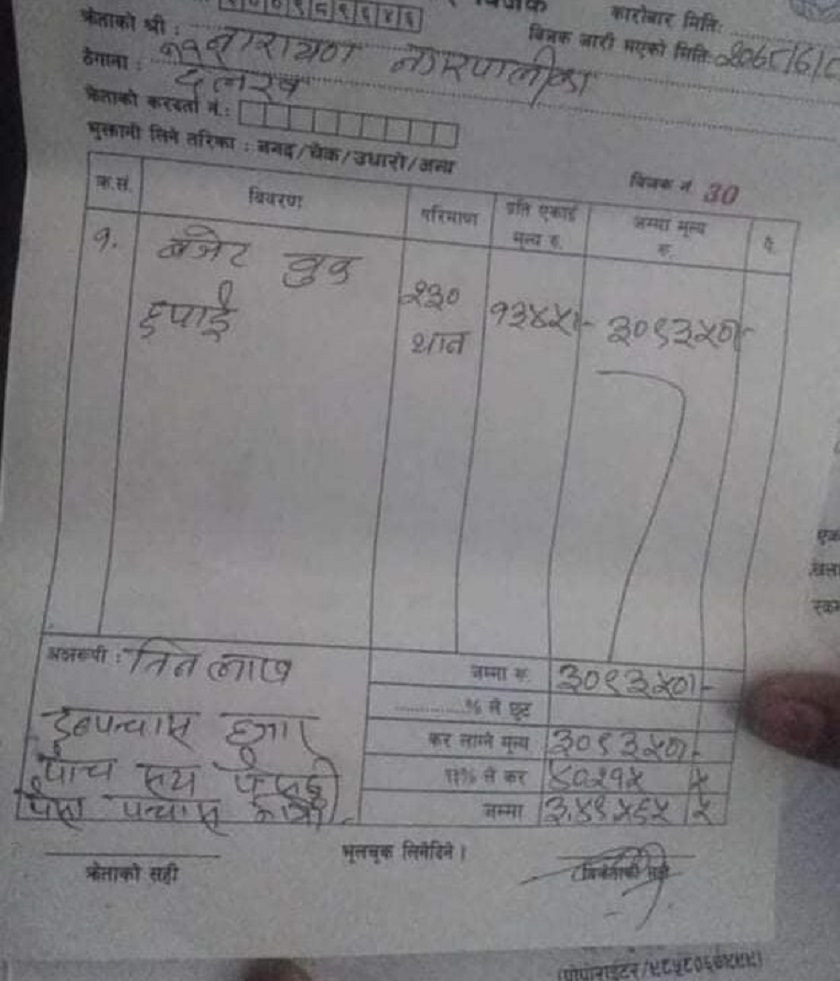 नगरपालिकाले मागेको कोटेशनमा सबैभन्दा कम मूल्य प्रतिकिताब एक हजार तीनसय ४५ रुपैयाँ कवोल भएको भन्दै एक छापाखानालाई दुई सय ३० वटा किताब छाप्न दिएको छ । किताब छाप्नका लागि प्रतिकिताब एक हजार तीन सय ४५ का दरले तीन लाख नौ हजार तीन सय पचास रुपैयाँ भुक्तानी गरेको पाइएको हो ।